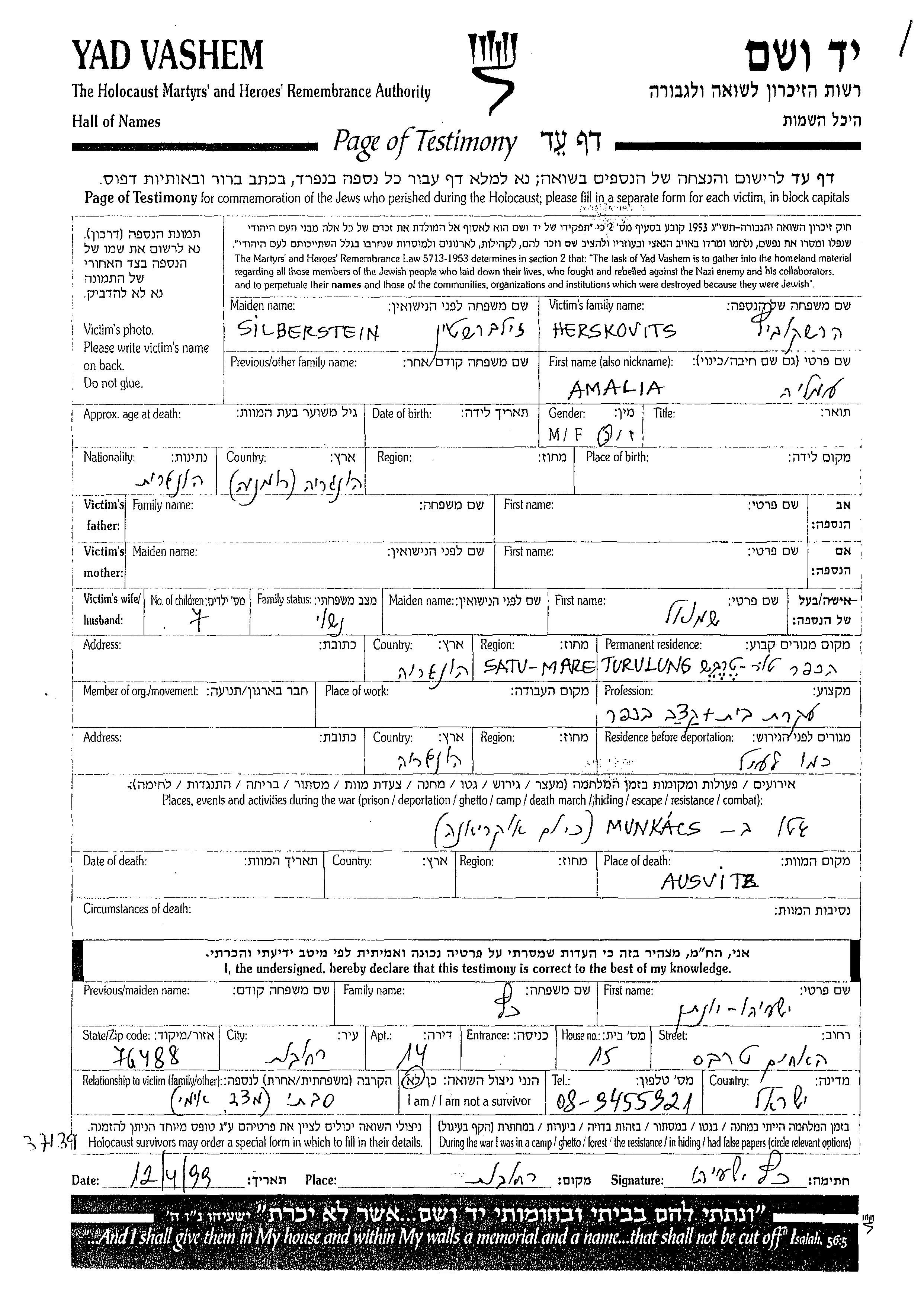 Amalia Hershkovitz, geb. Silberstein wurde in Ungarn geboren. Sie war Hausfrau. Vor dem Zweiten Weltkrieg lebte sie in Turulung, Rumänien.