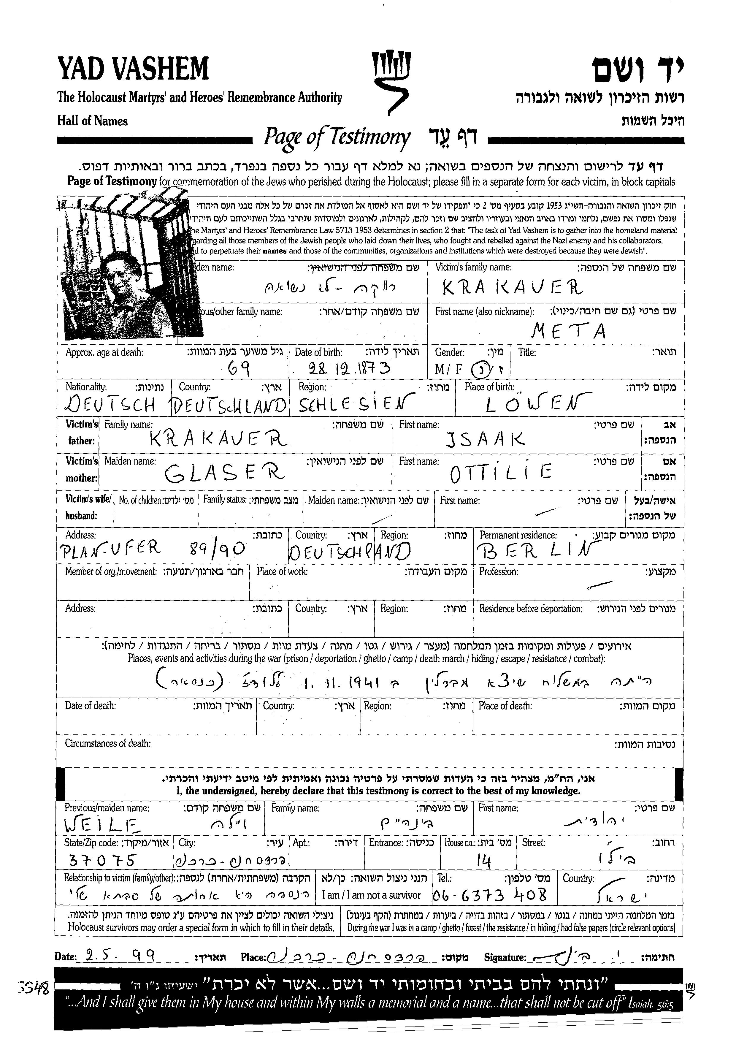 Meta Krakaver wurde im Jahr 1873 in Loewen, Deutsches Reich geboren. Vor dem Zweiten Weltkrieg lebte sie in Berlin, Deutsches Reich.