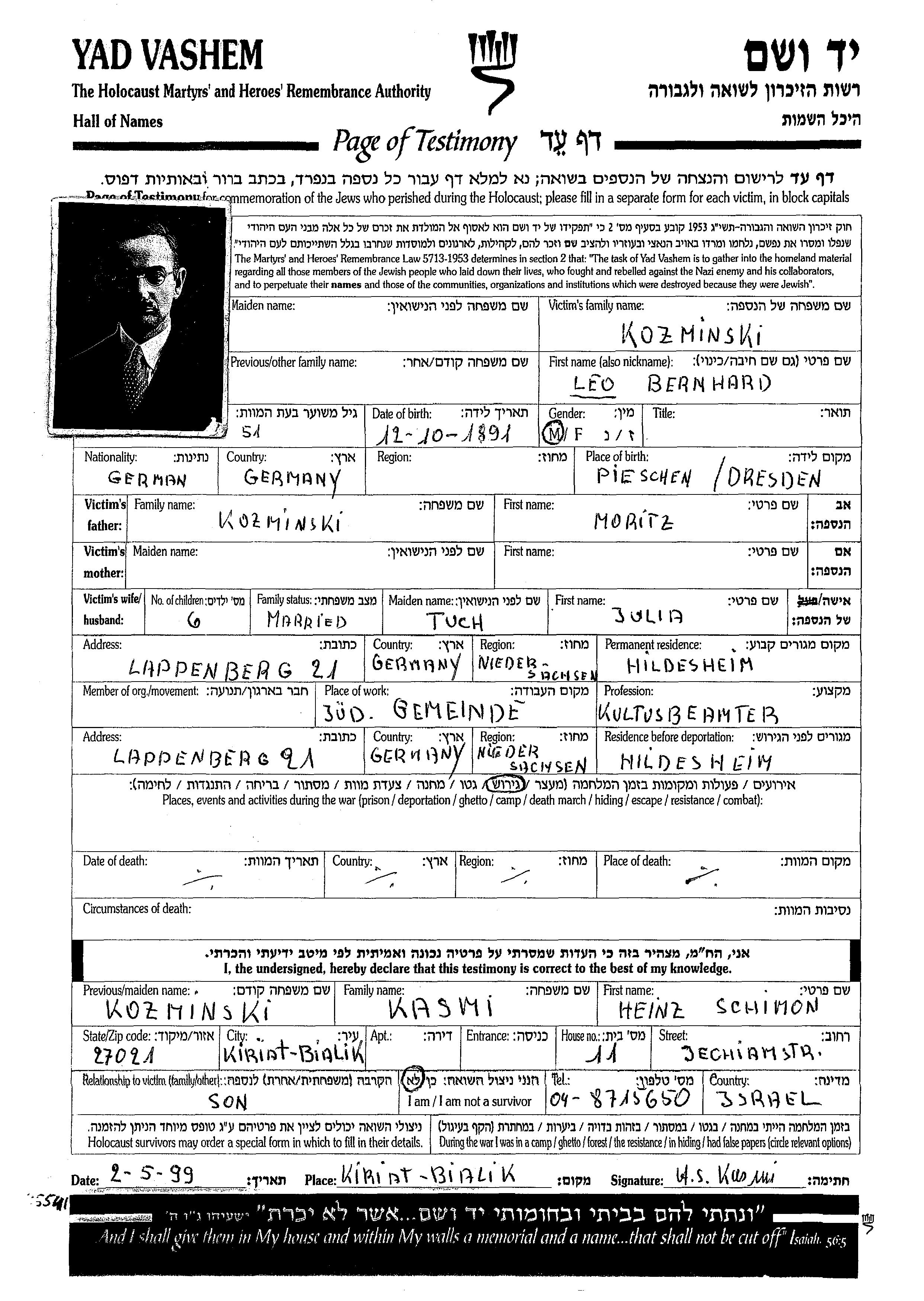 Bernhard Leo Kozminski wurde im Jahr 1891 in Pieschen, Deutsches Reich geboren. Er war Kultusbeamter. Vor dem Zweiten Weltkrieg lebte er in Hildesheim, Deutsches Reich.