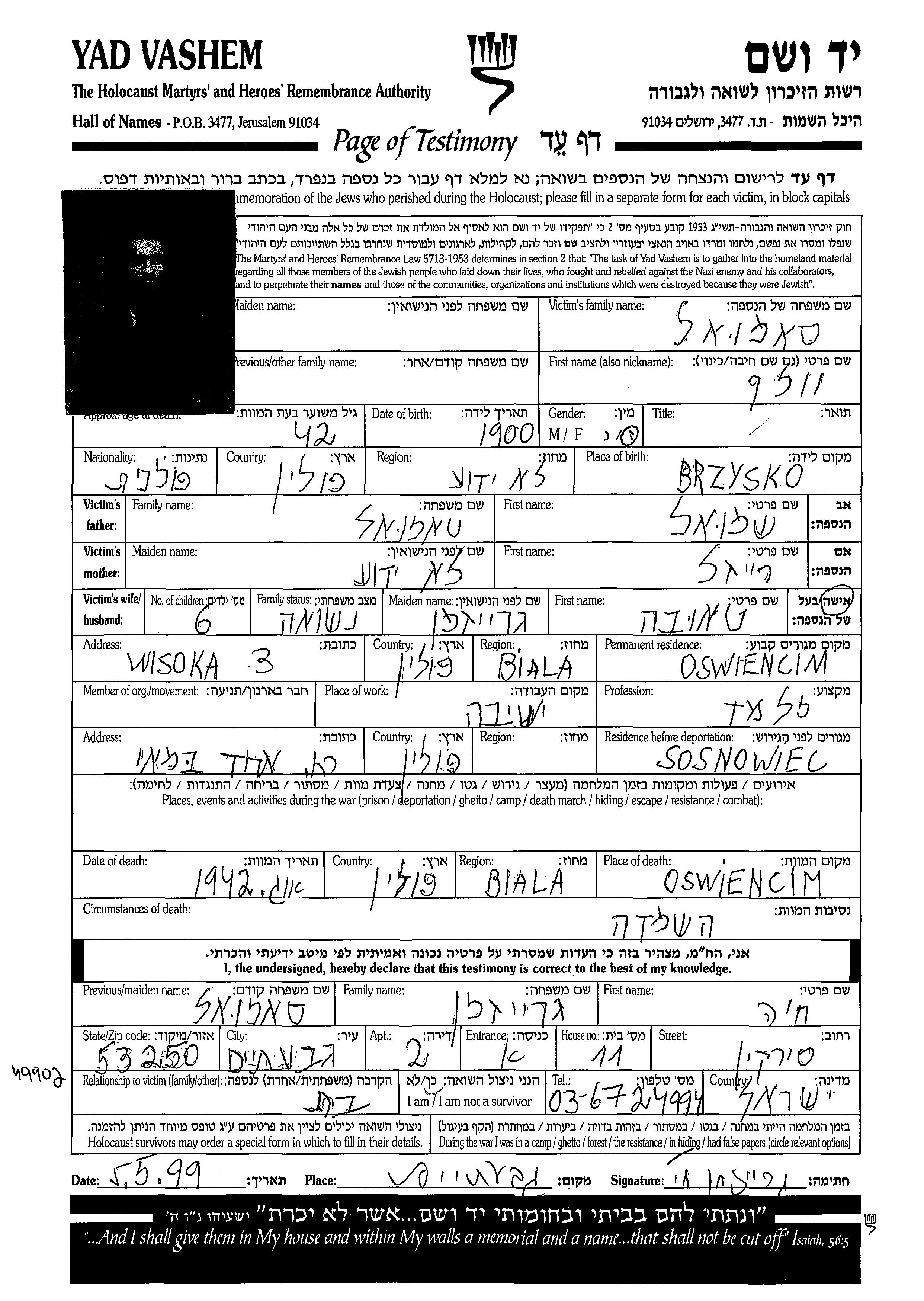 Volf Samuel wurde im Jahr 1942 in Brzesko, Polen geboren. Er war מלמד בישיבה. Vor dem Zweiten Weltkrieg lebte er in Oświęcim, Polen.