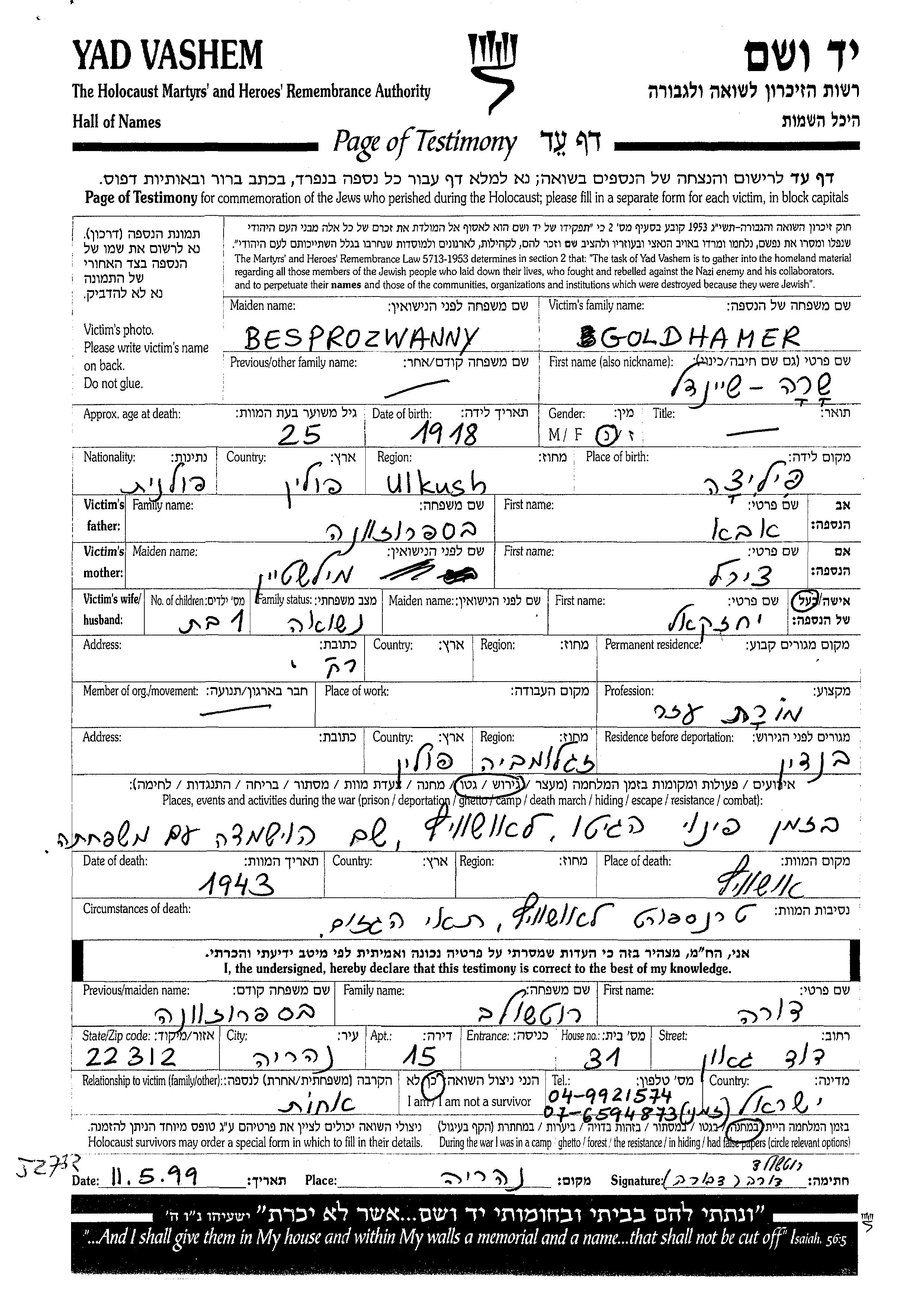 Sara Sheindl Goldhamer, geb. Bezprozwanny wurde im Jahr 1918 in Pilica, Polen geboren. Sie war עוזרת למורה.
