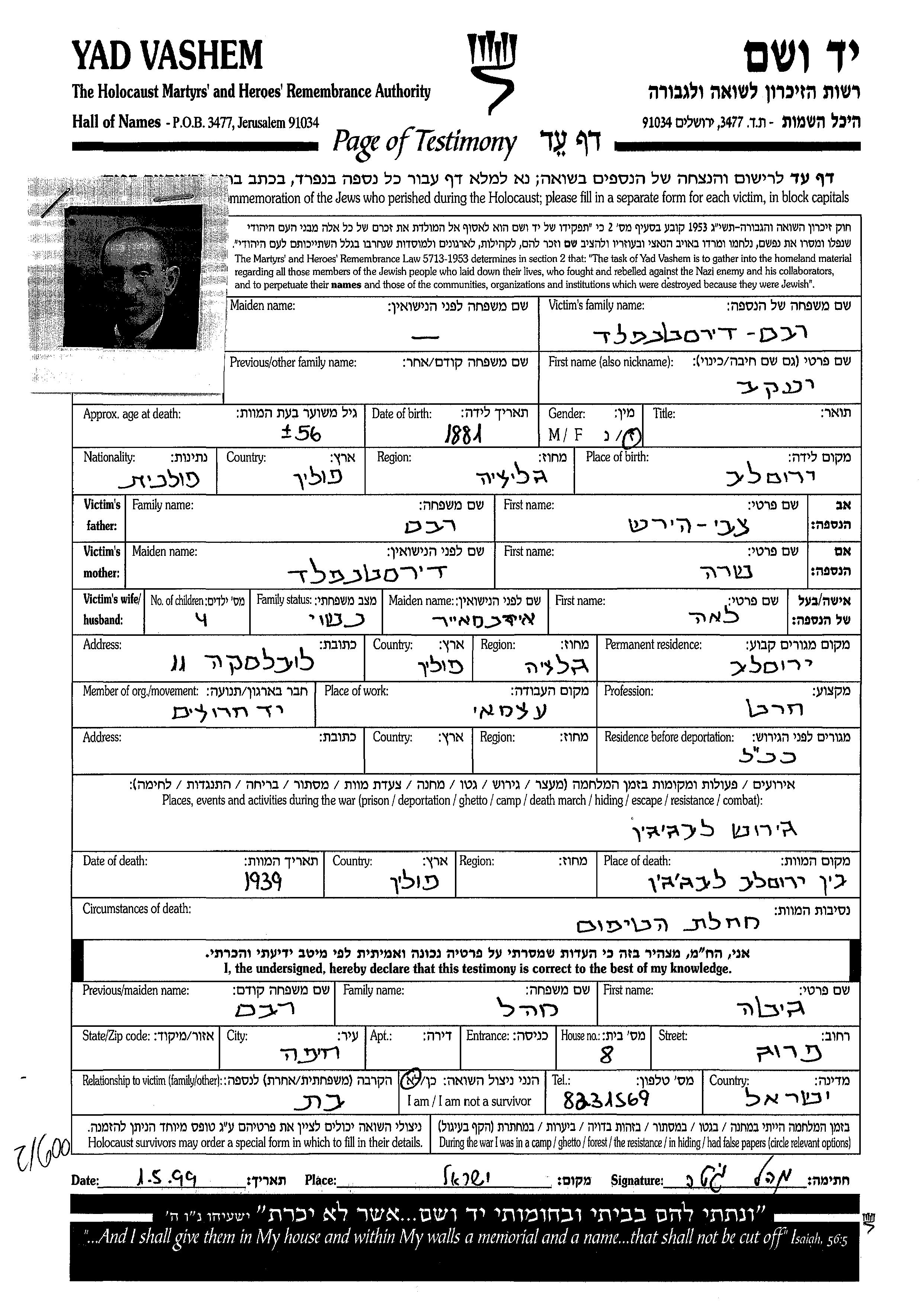 Yaakov wurde in der Schoah ermordet. Todesort: Galizien Region, Polen.