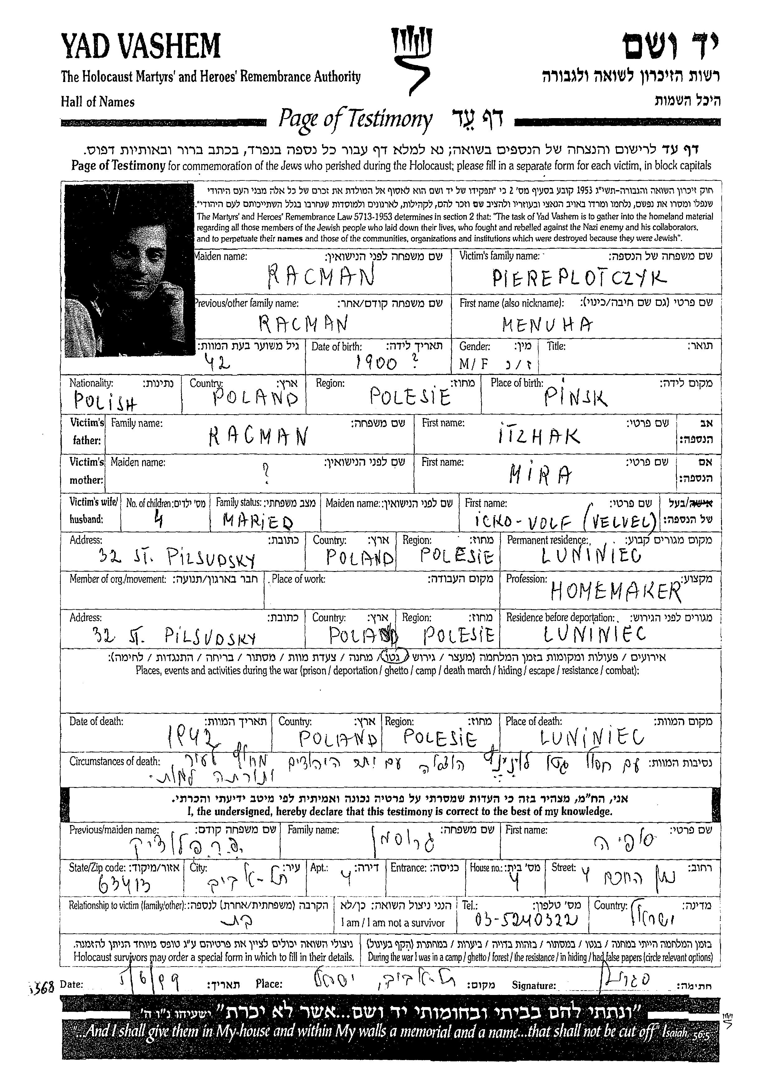 Menuha Piereplotczyk, geb. Racman wurde im Jahr 1900 in Pinsk, Polen geboren. Sie war Hausfrau. Vor dem Zweiten Weltkrieg lebte sie in Luniniec, Polen.