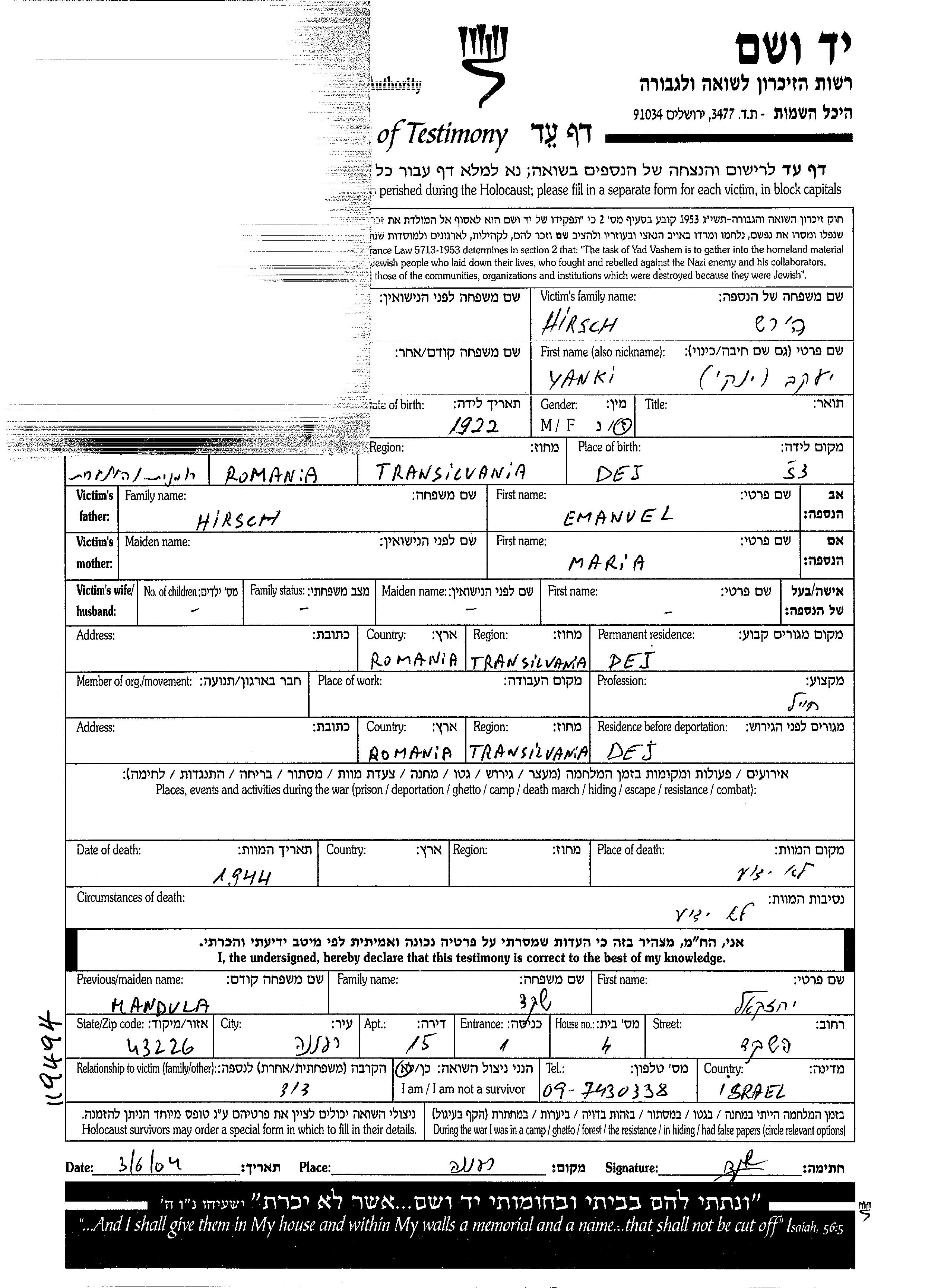 Yaakov Hirsch wurde im Jahr 1922 in Dej, Rumänien geboren. Er war Soldat. Vor dem Zweiten Weltkrieg lebte er in Dej, Rumänien.