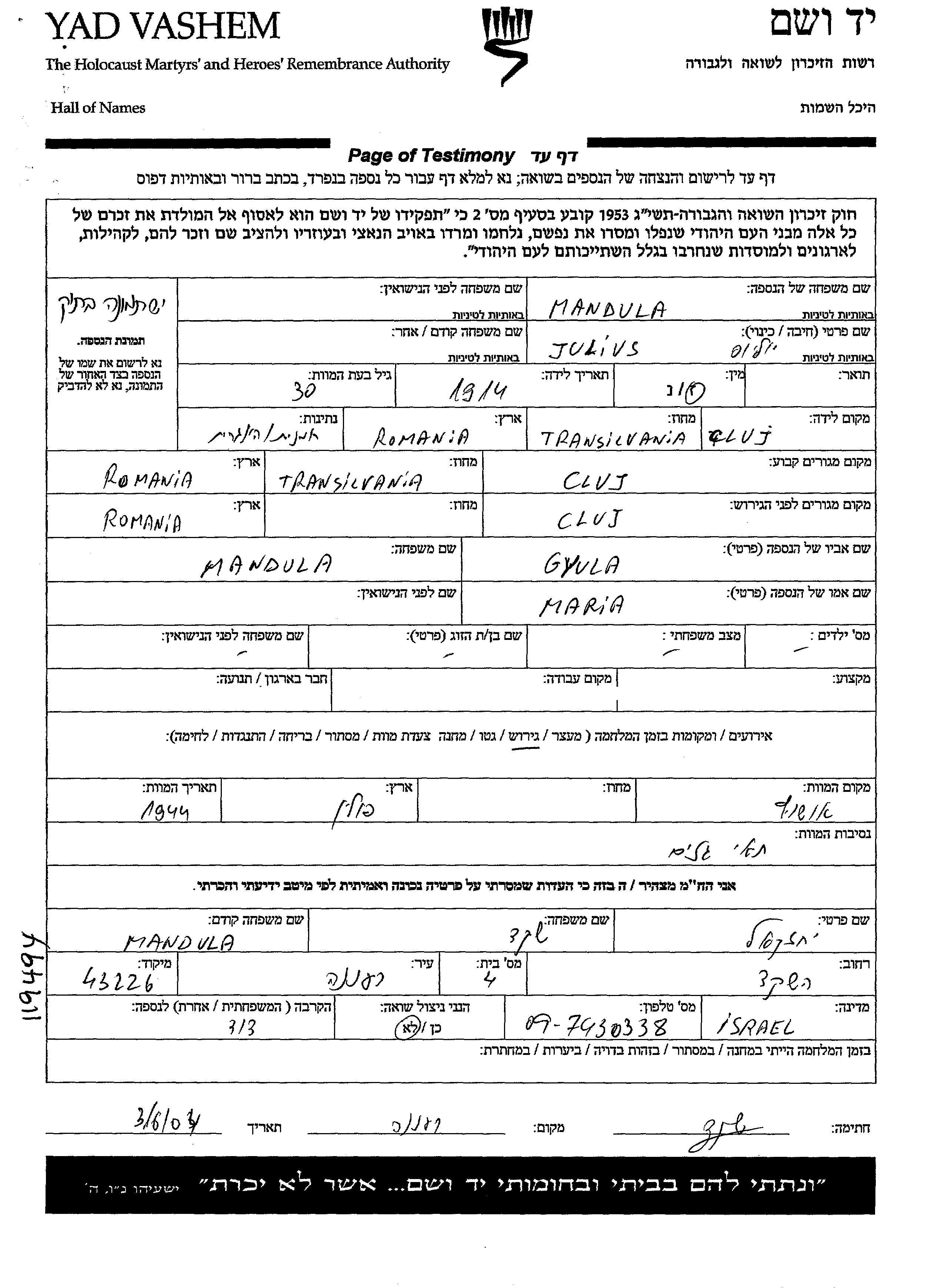 Julius Mandula wurde im Jahr 1914 in Cluj, Rumänien geboren. Vor dem Zweiten Weltkrieg lebte er in Cluj, Rumänien.