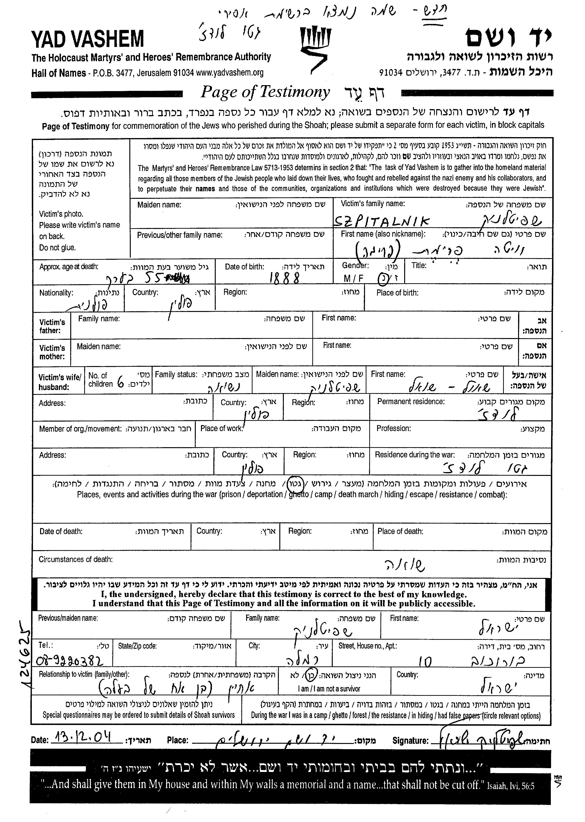 Frimet Vita Szpitalnik wurde im Jahr 1888 in Polen geboren. Vor dem Zweiten Weltkrieg lebte sie in Łódź, Polen.