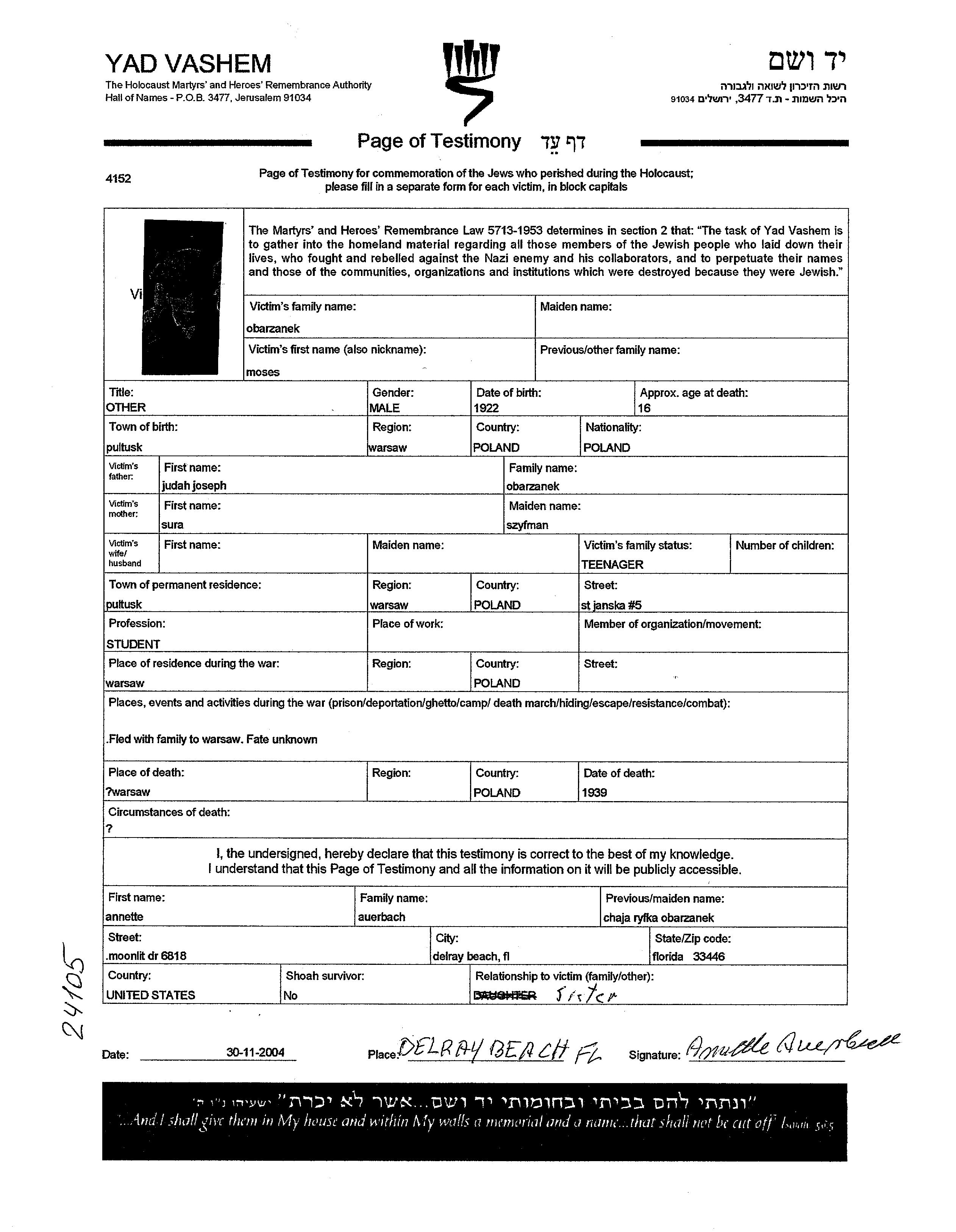 Moses Obarzanek wurde im Jahr 1922 in Pultusk, Polen geboren. Vor dem Zweiten Weltkrieg lebte er in Pultusk, Polen.