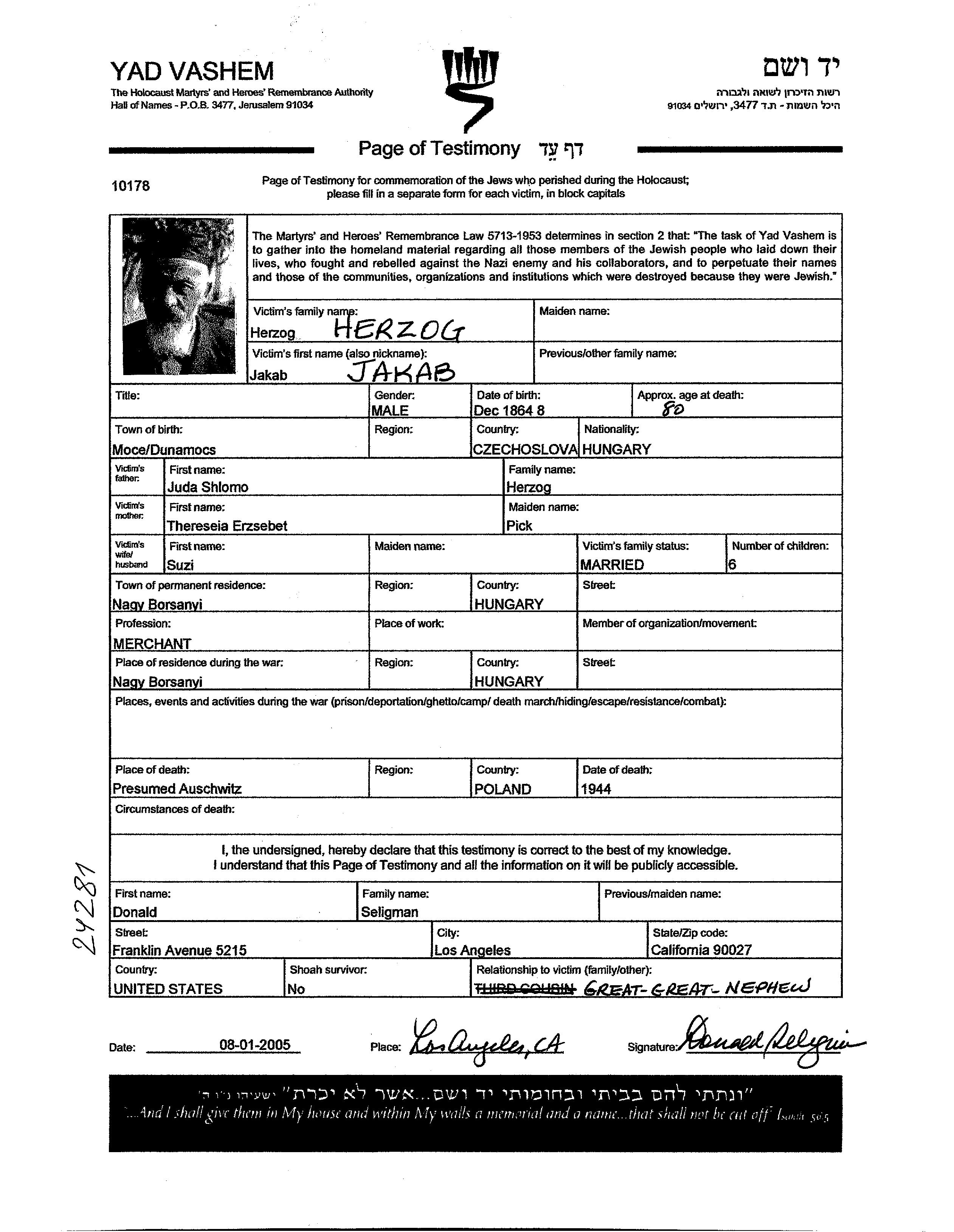 Herzog | Jakab | 1864 | Nagyborsa, Tschechoslowakei | Gedenkblatt (digital, unterzeichnet) |