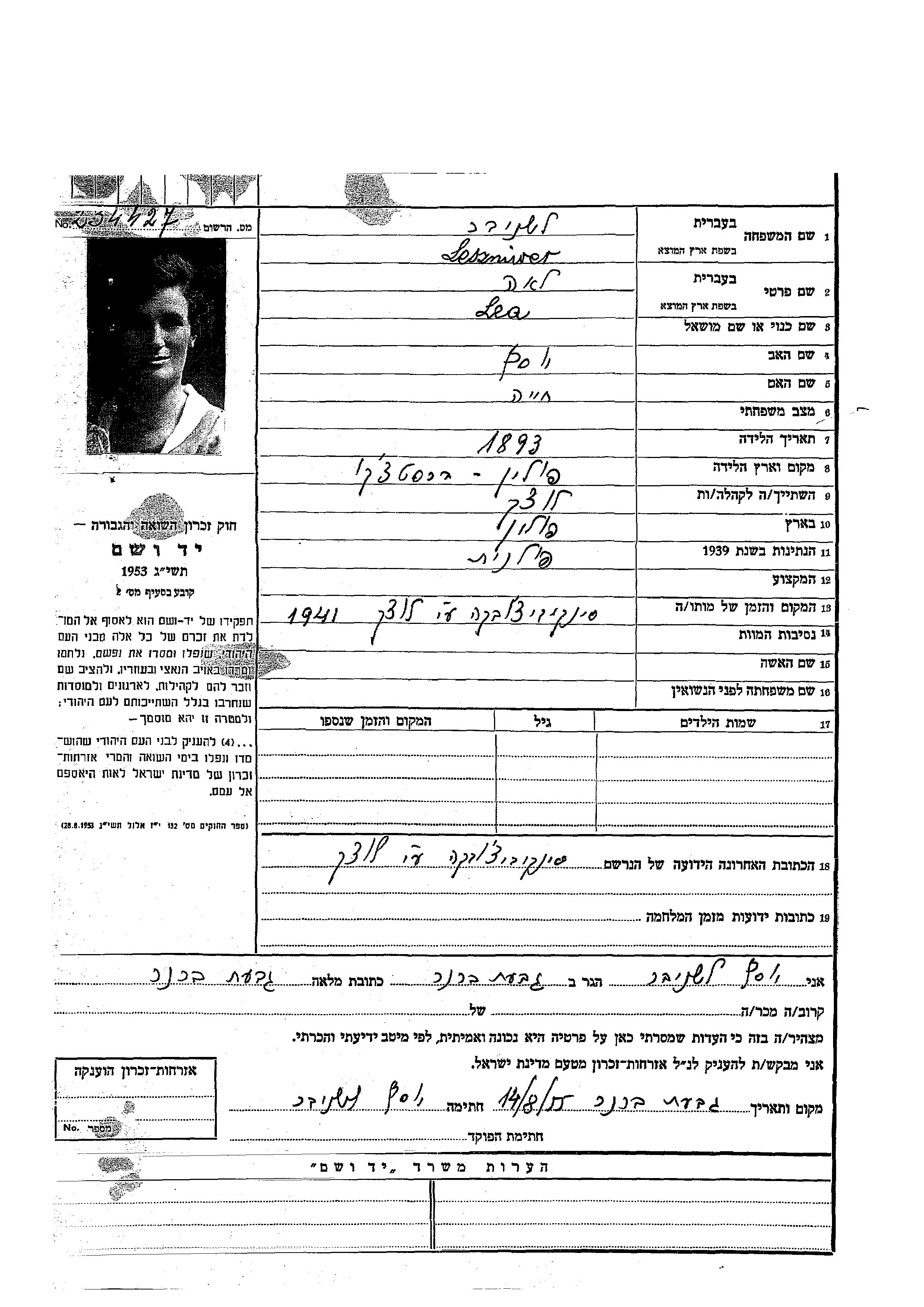 Lea Leszniwer wurde im Jahr 1893 in Beresteczko, Polen geboren. Vor dem Zweiten Weltkrieg lebte sie in Luck, Polen.