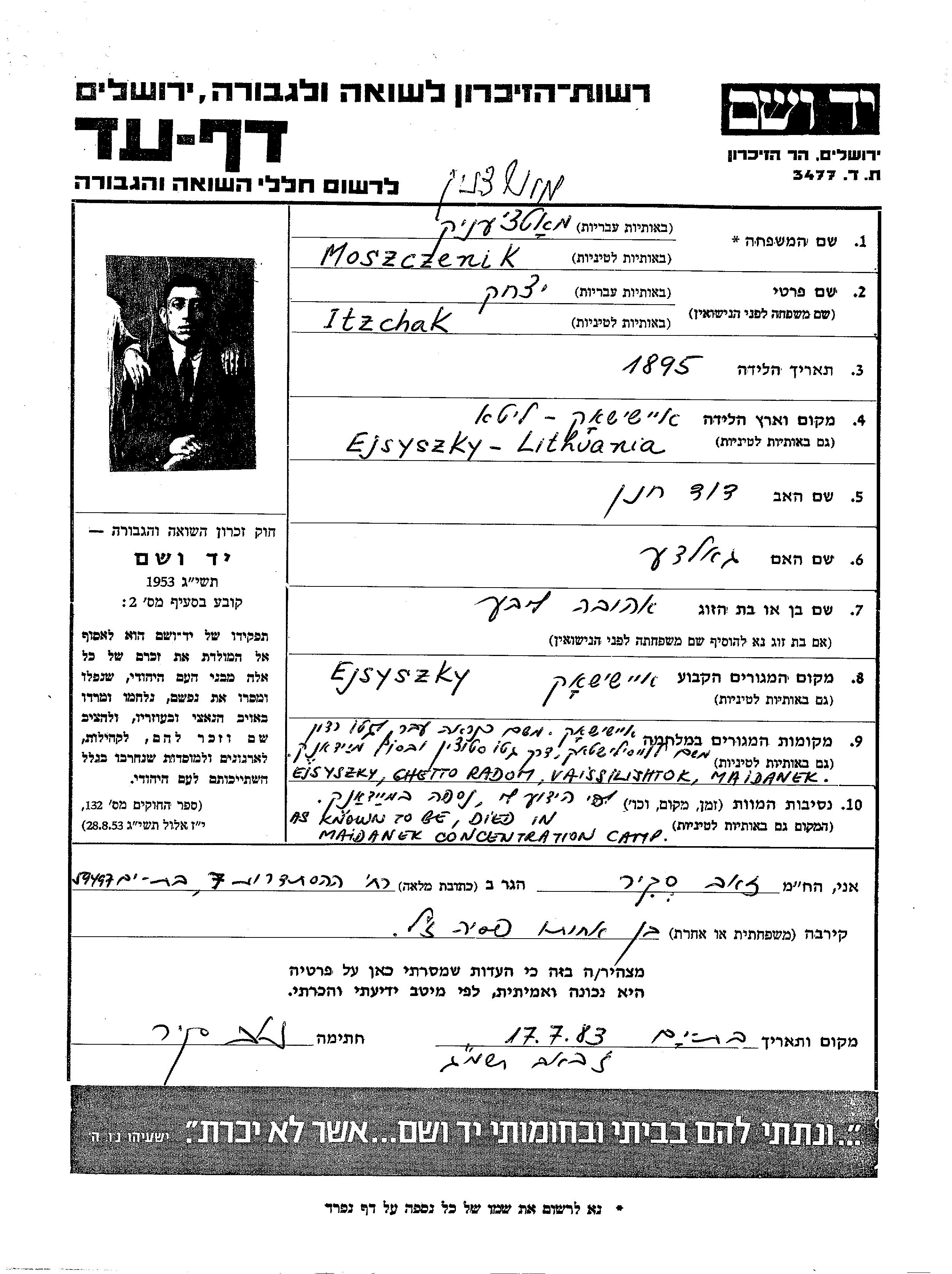 Itzchak Moszczenik wurde im Jahr 1895 in Ejszyszki, Polen geboren. Vor dem Zweiten Weltkrieg lebte er in Ejszyszki, Polen.