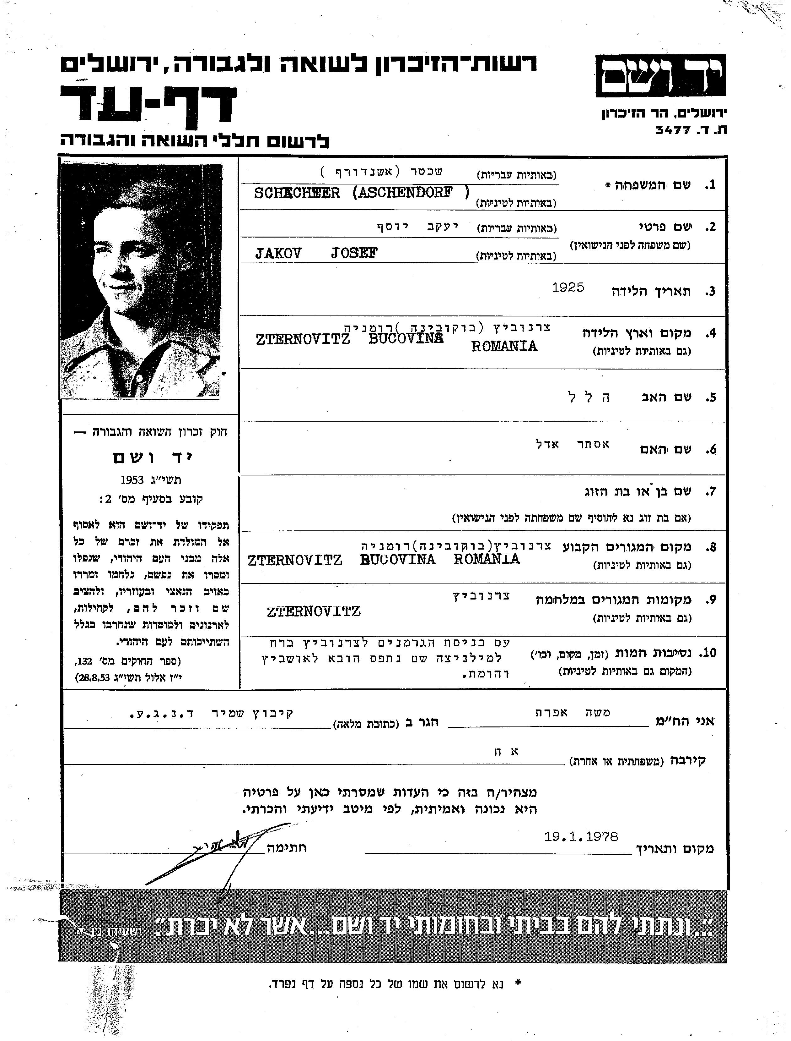 Schachter Aschendorf Jakov Josef 1925 Cernauti, Rumänien Gedenkblatt