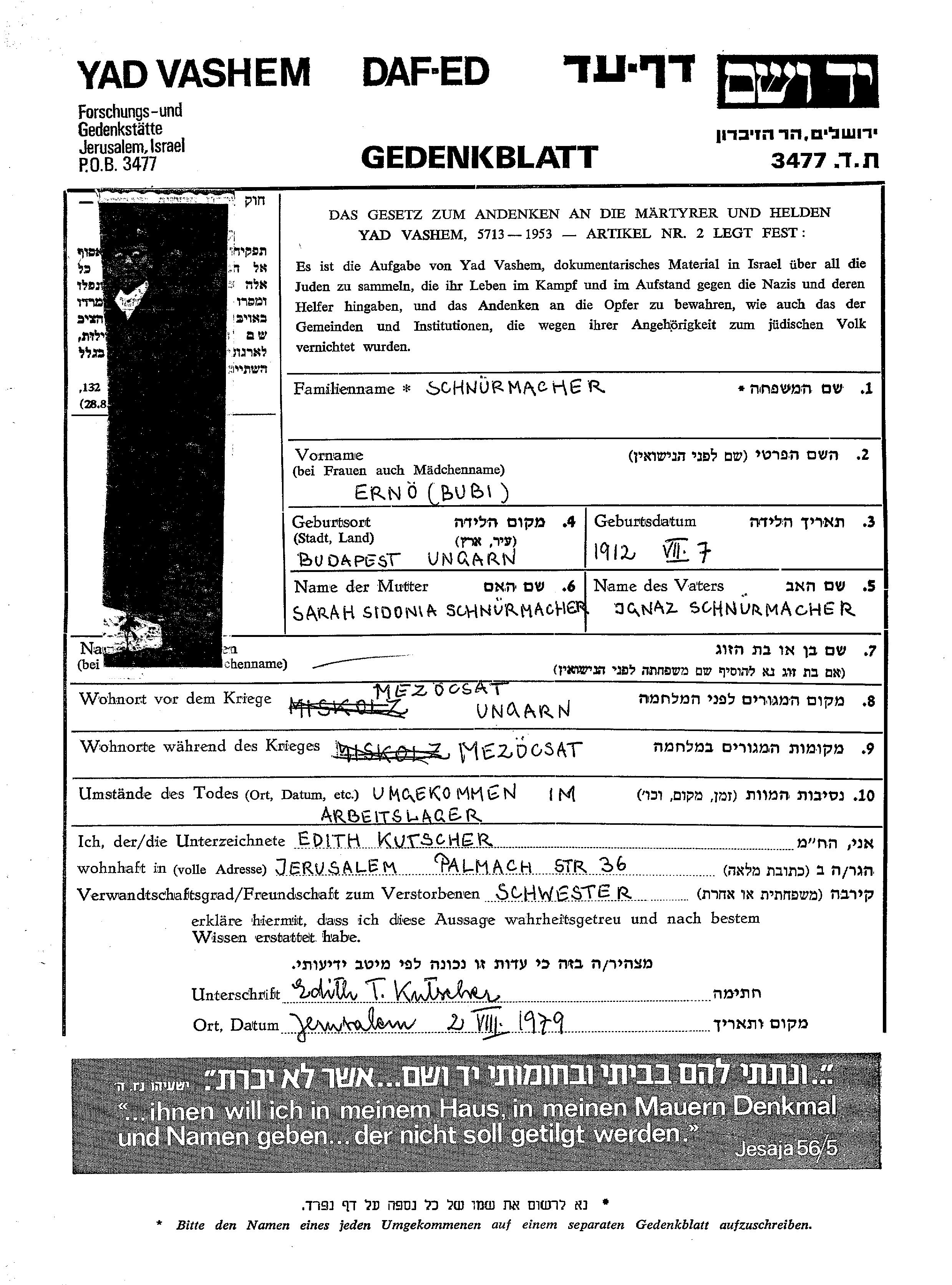 Schnümacher | Erno | 1912 | Mezocsat, Ungarn | Gedenkblatt |