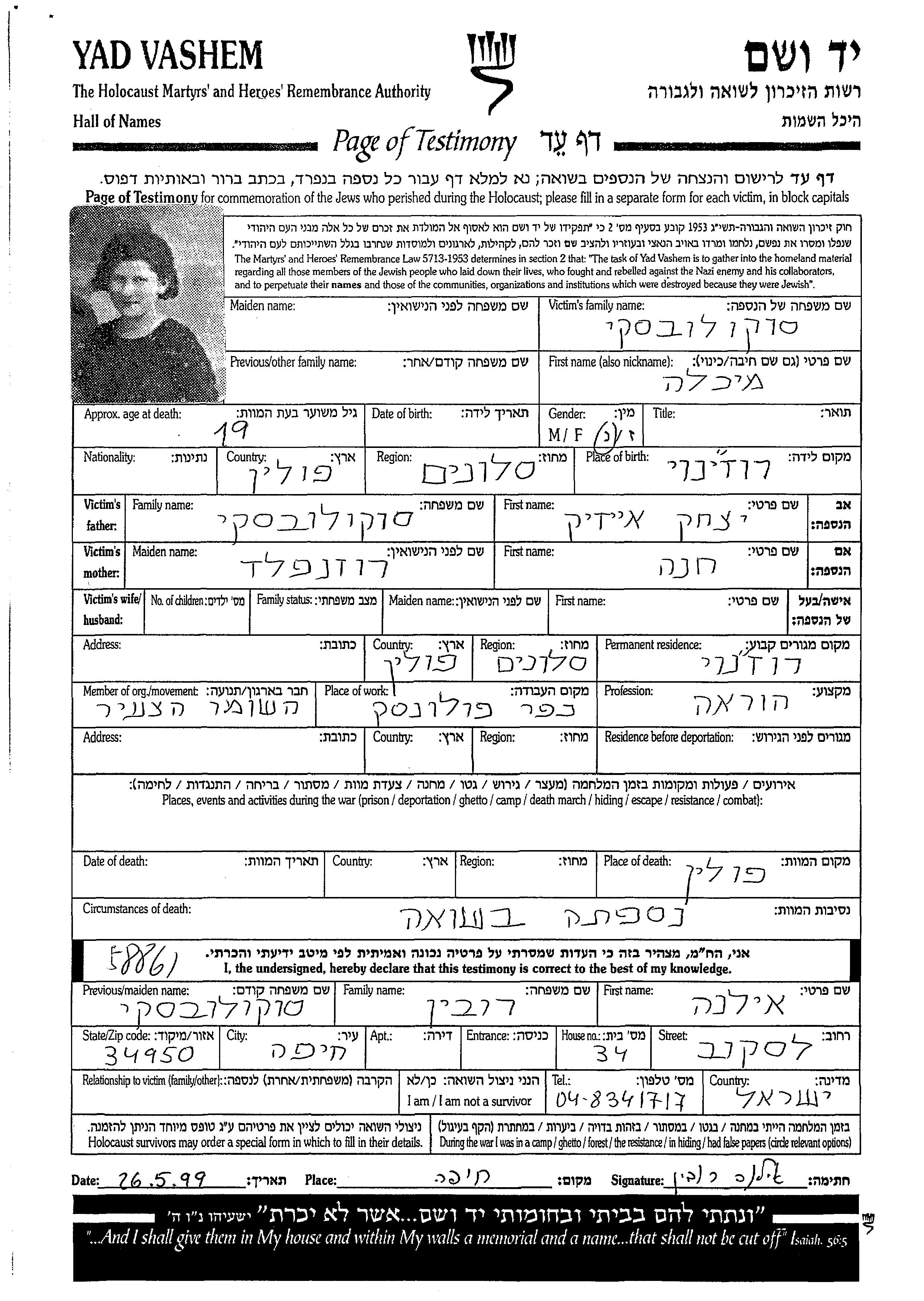Mikhla Sokolovski wurde in Rozana, Polen geboren. Vor dem Zweiten Weltkrieg lebte sie in Rozana, Polen.