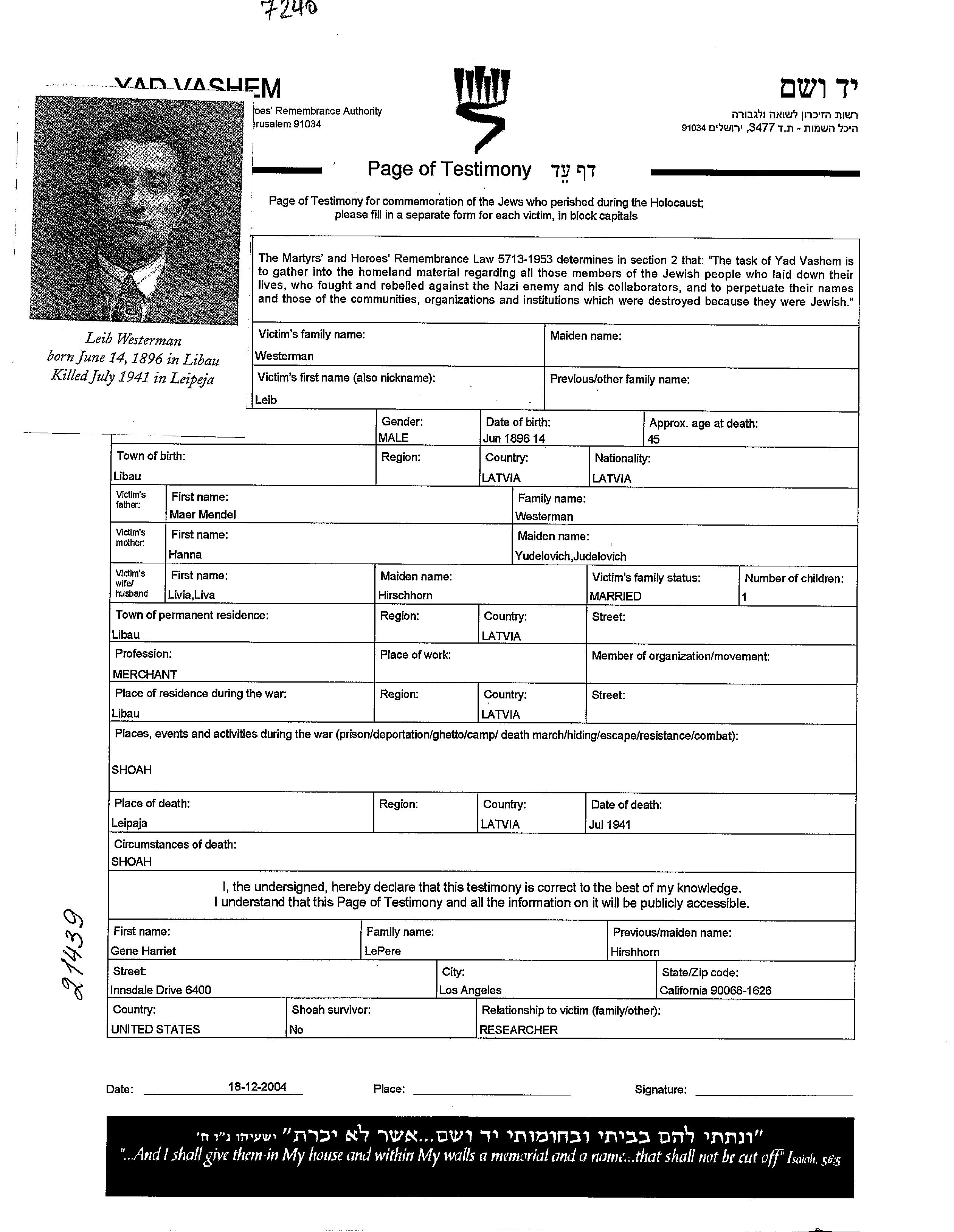Leib Westerman wurde im Jahr 1896 in Liepaja, Lettland geboren. Vor dem Zweiten Weltkrieg lebte er in Liepaja, Lettland.