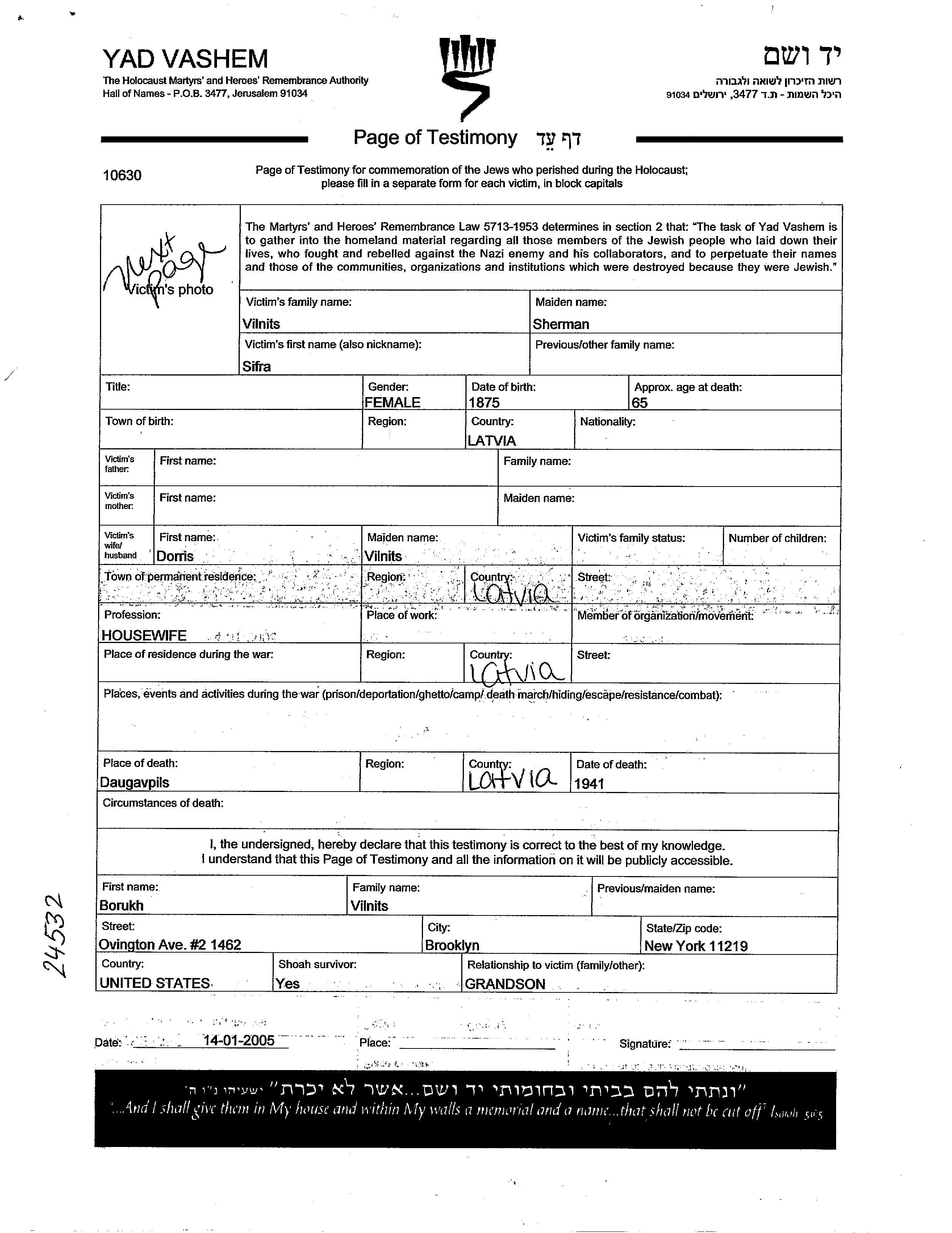 Sifra Vilnits, geb. Sherman wurde im Jahr 1875 in Lettland geboren. Vor dem Zweiten Weltkrieg lebte sie in Lettland.