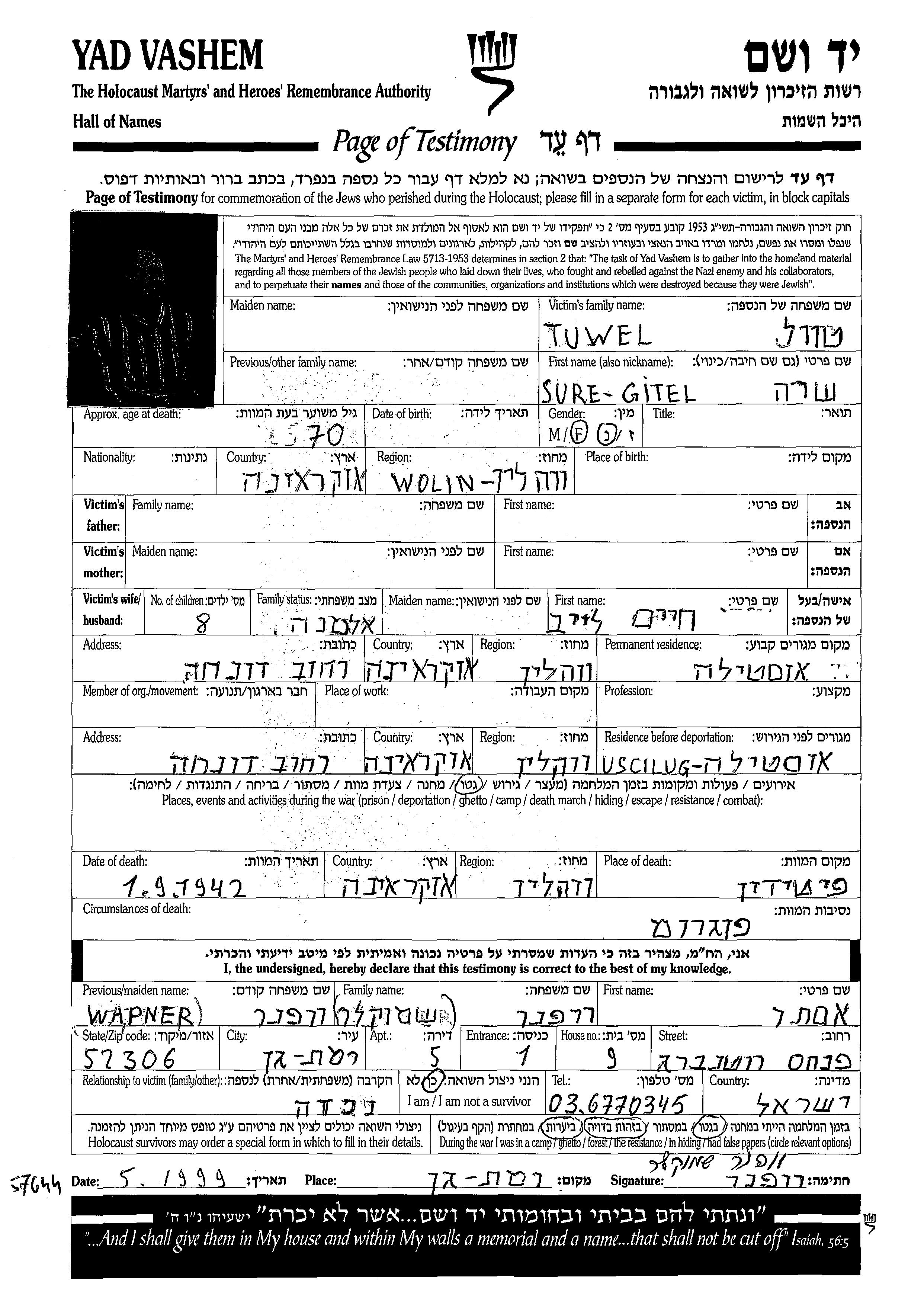Sure Gitel wurde in der Schoah ermordet. Todesort: Piatyden, Massaker Ort im Jahr 01/09/1942.
