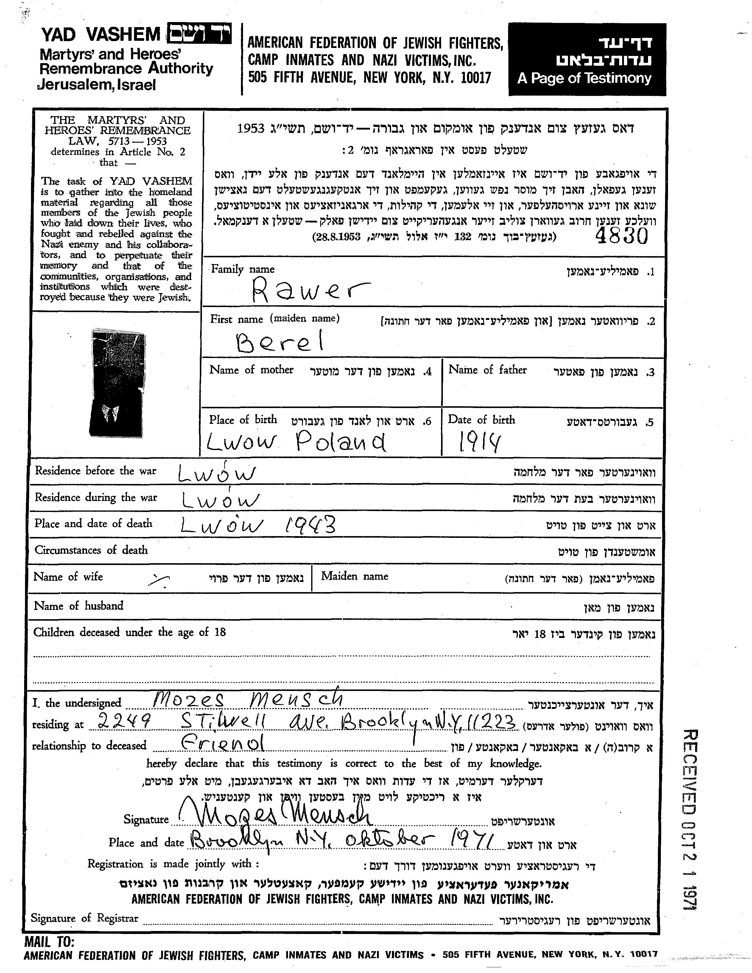 Berl Rawer wurde im Jahr 1914 in Lwow, Polen geboren. Vor dem Zweiten Weltkrieg lebte er in Lwow, Polen.