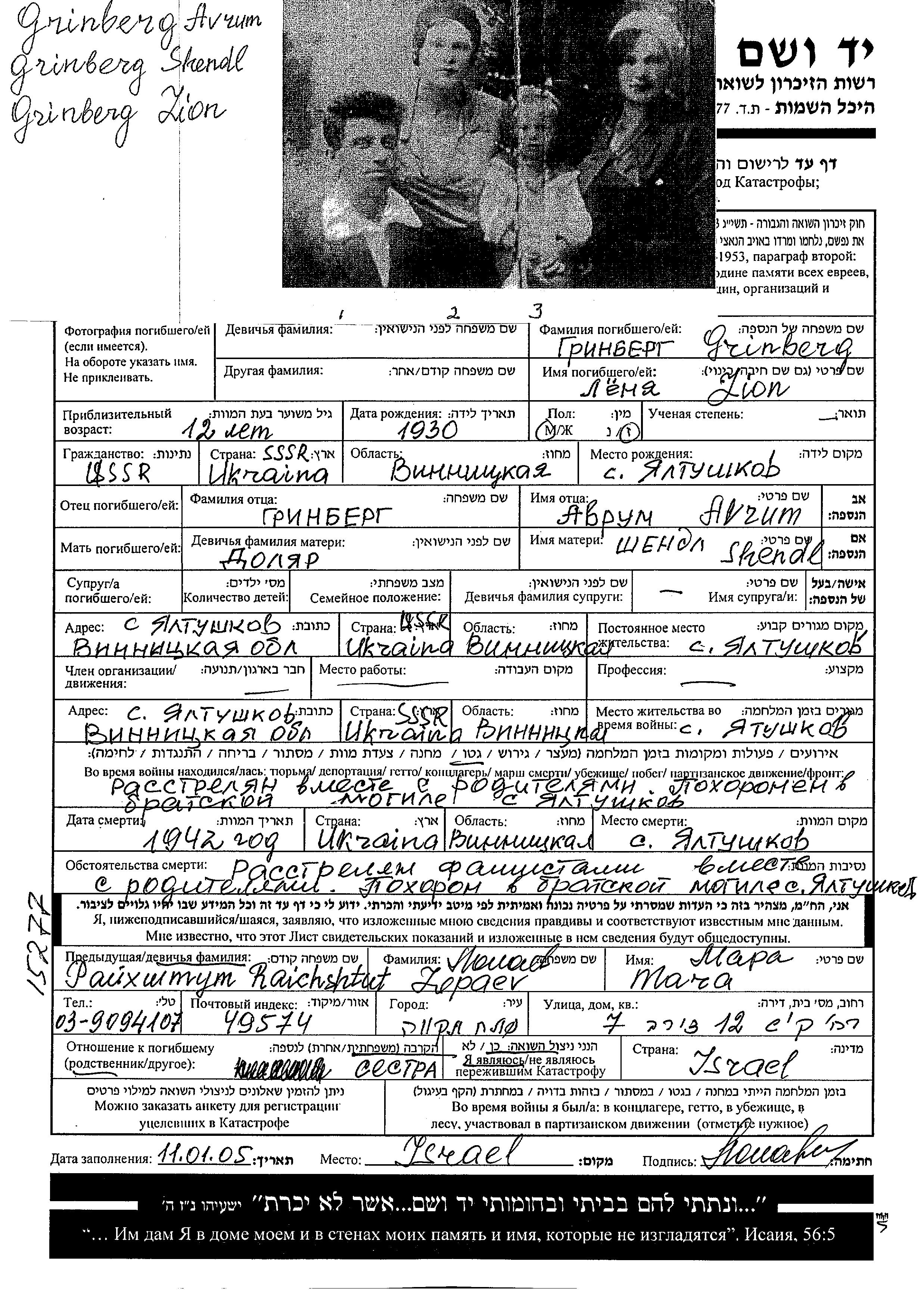 | Grinberg | Lyonya Lion | 1930 | Yaltushkov, Ukraine (UdSSR) | Gedenkblatt |