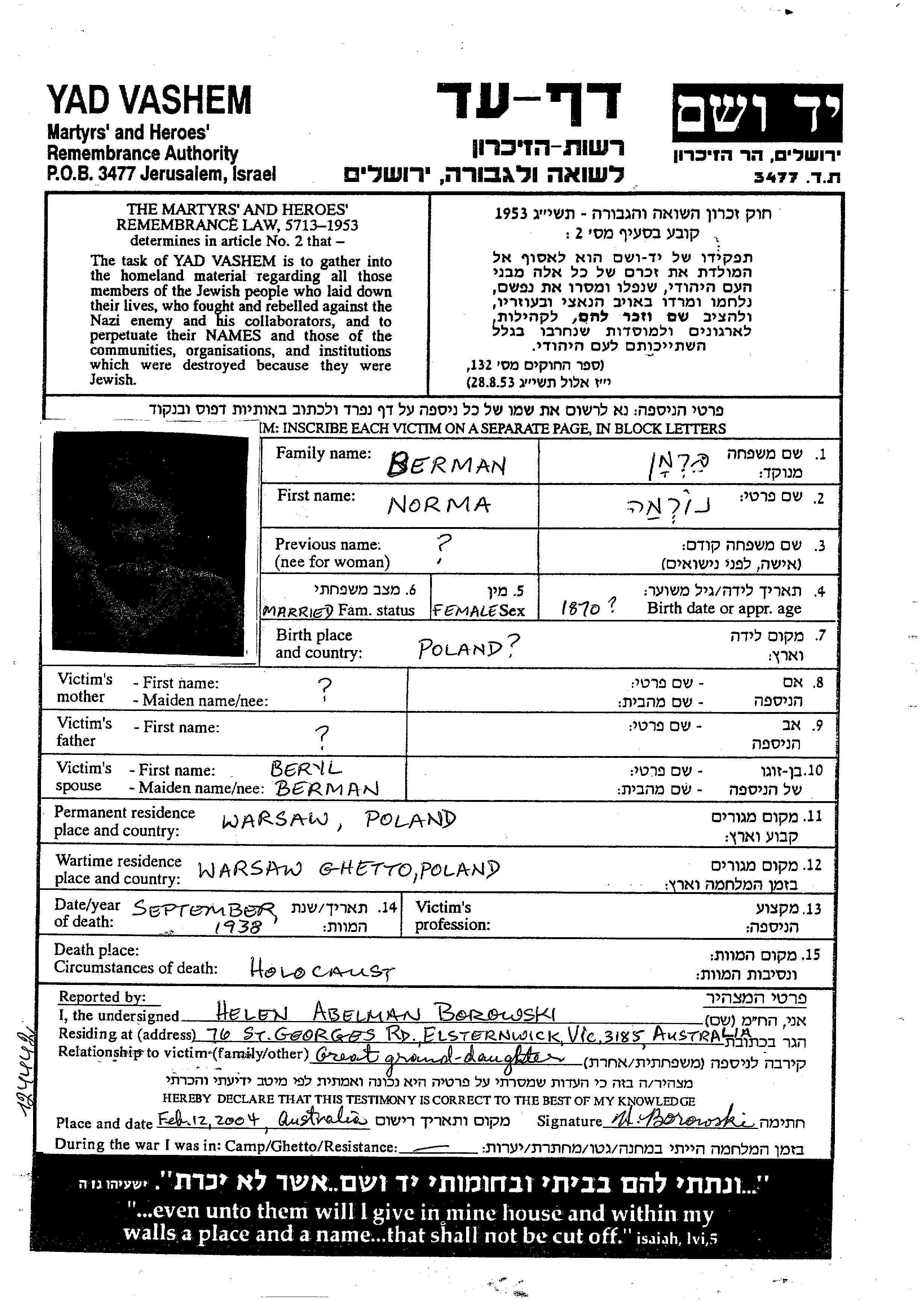 Norma Berman wurde im Jahr 1870 in Polen geboren. Vor dem Zweiten Weltkrieg lebte sie in Warszawa, Polen.