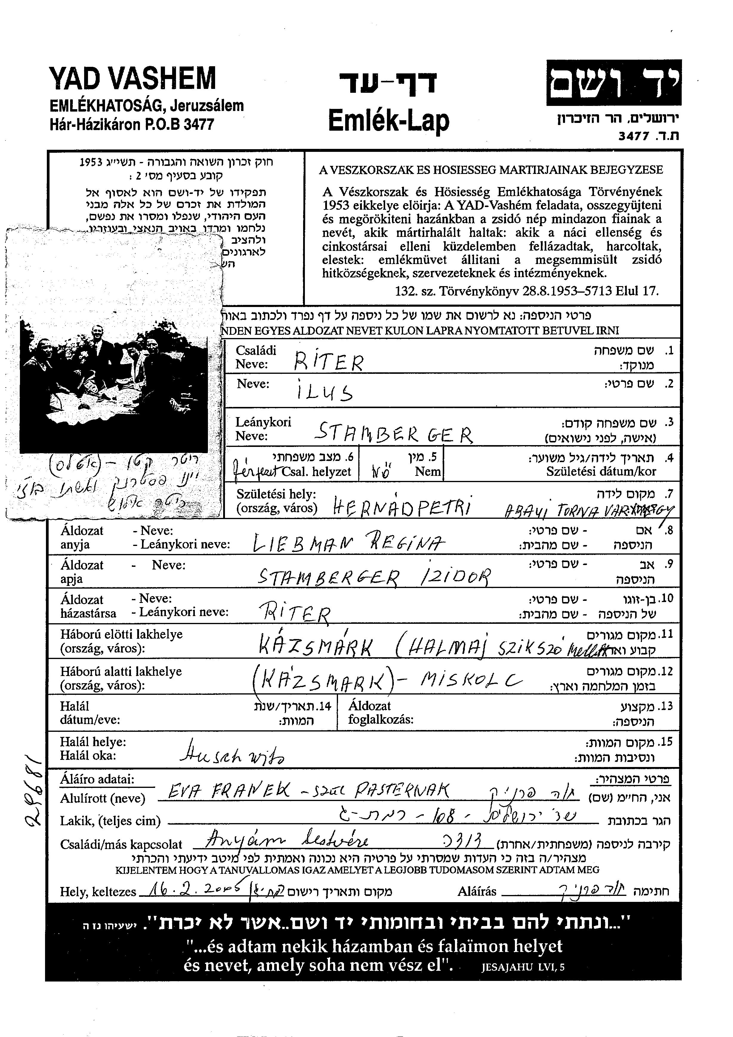 Ilus Riter, geb. Stamberger wurde in Hernadpetri, Ungarn geboren. Vor dem Zweiten Weltkrieg lebte sie in Kazsmark, Ungarn.
