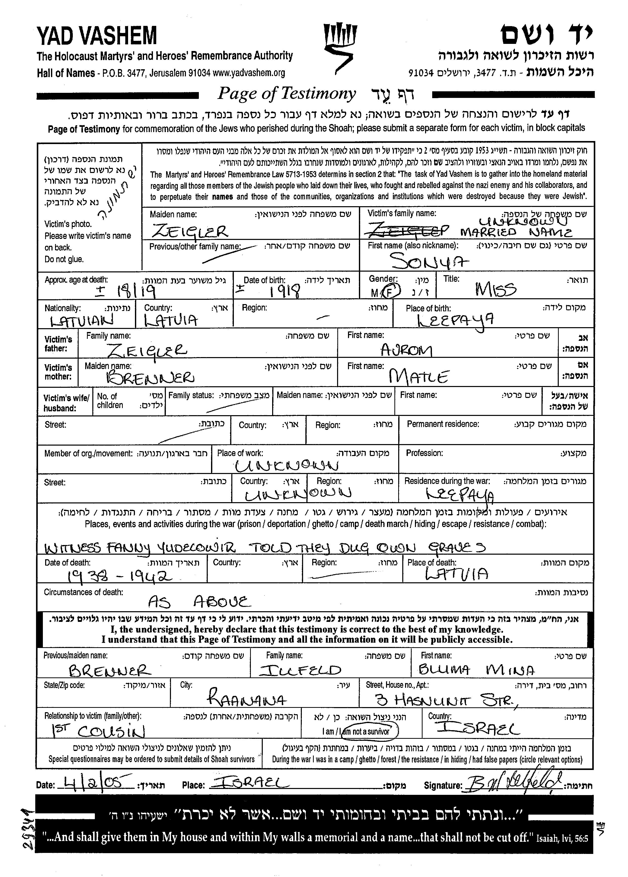 Sonya Name unbekannt, geb. Zeigler wurde im Jahr 1918 in Liepaja, Lettland geboren. Vor dem Zweiten Weltkrieg lebte sie in Liepaja, Lettland.