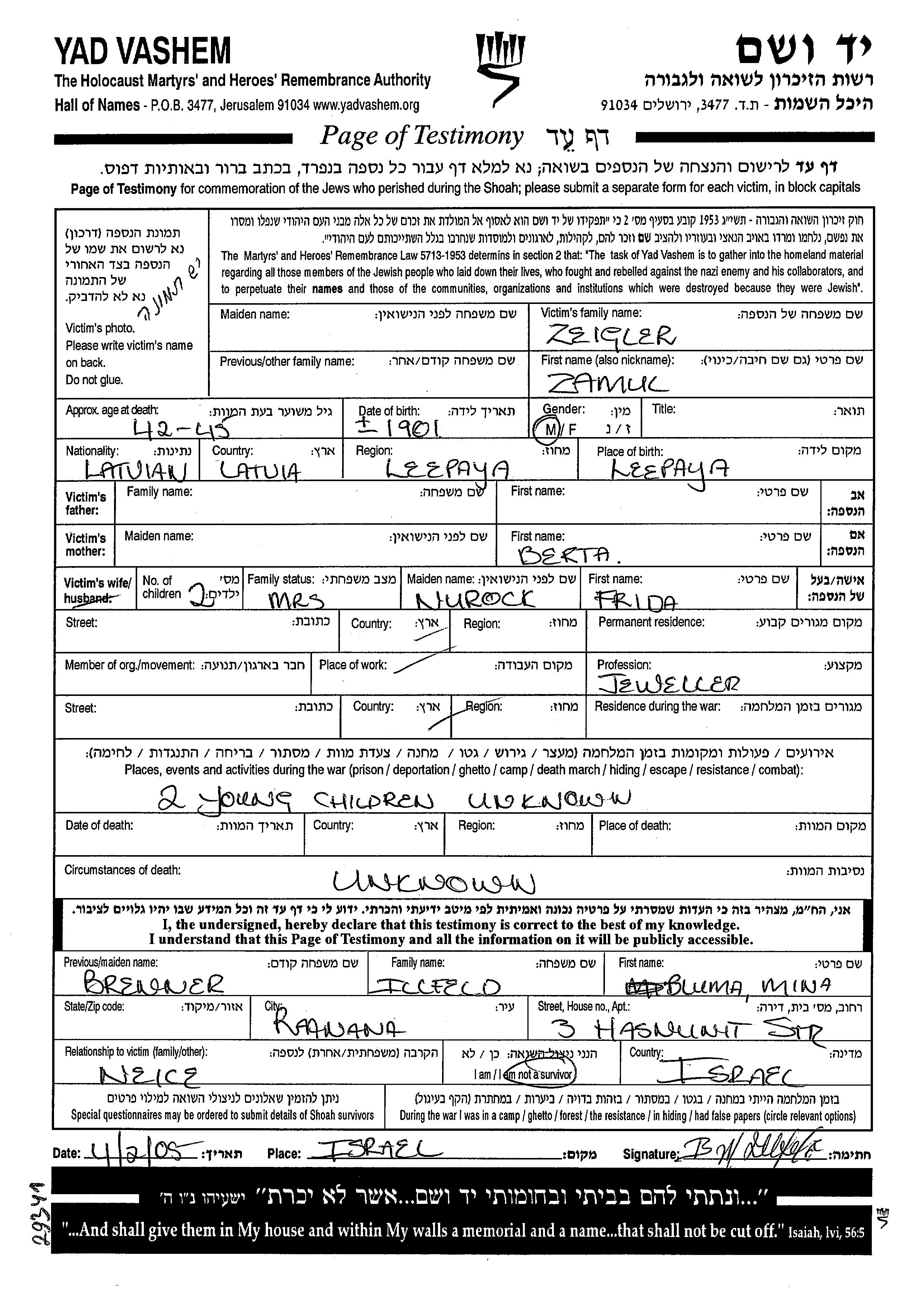 Zeigler | Zamul | 1901 | unbekannter Ort, | Gedenkblatt |