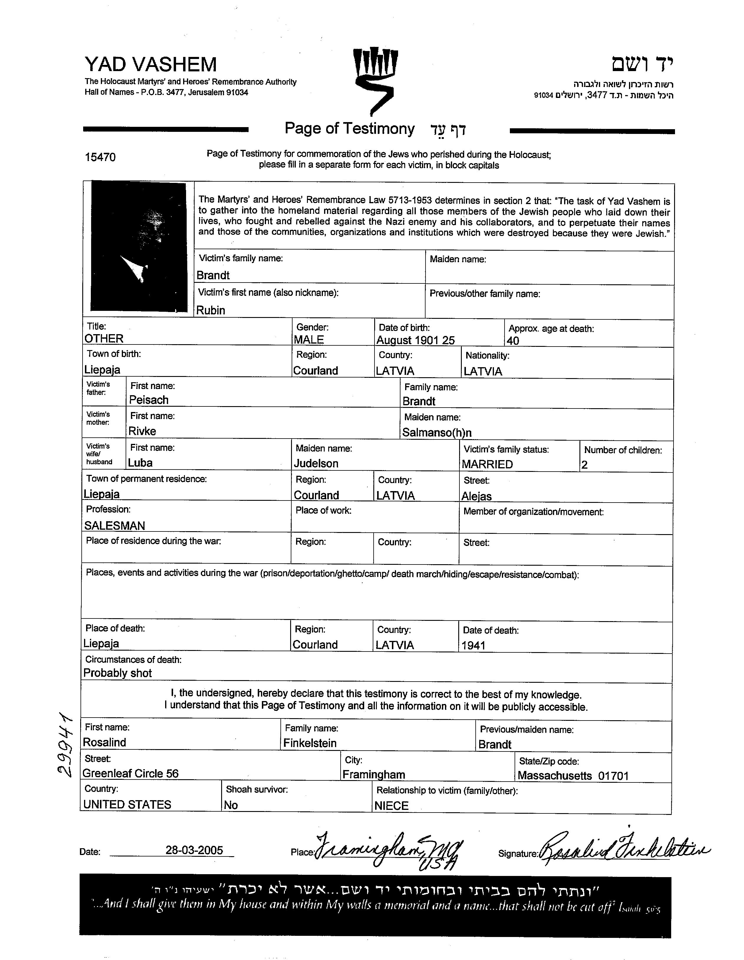 Rubin Brandt wurde im Jahr 1901 in Liepaja, Lettland geboren. Vor dem Zweiten Weltkrieg lebte er in Liepaja, Lettland.