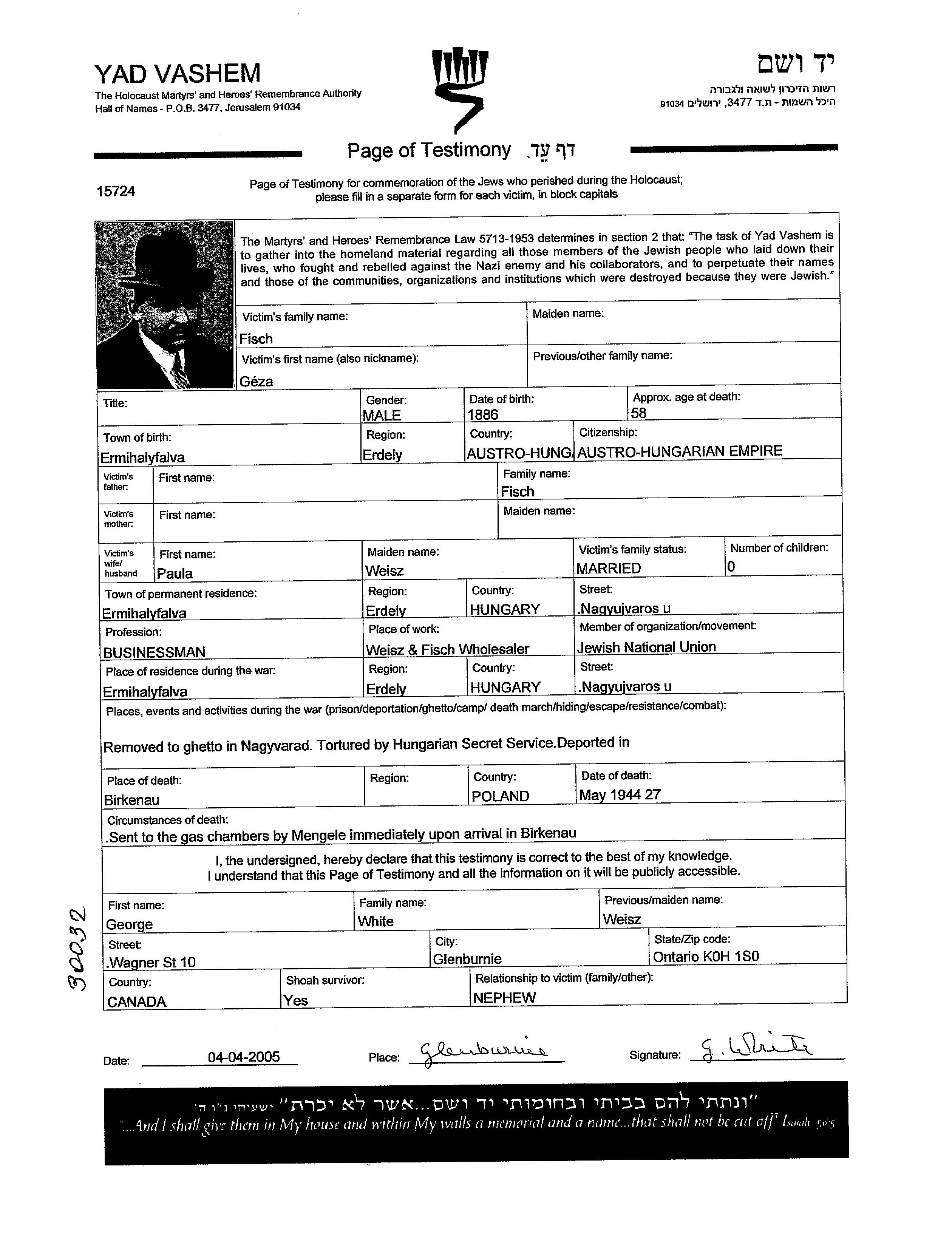 Fisch | Geza | 1886 | Ermihalyfalva, Rumänien | Gedenkblatt (digital, unterzeichnet) |