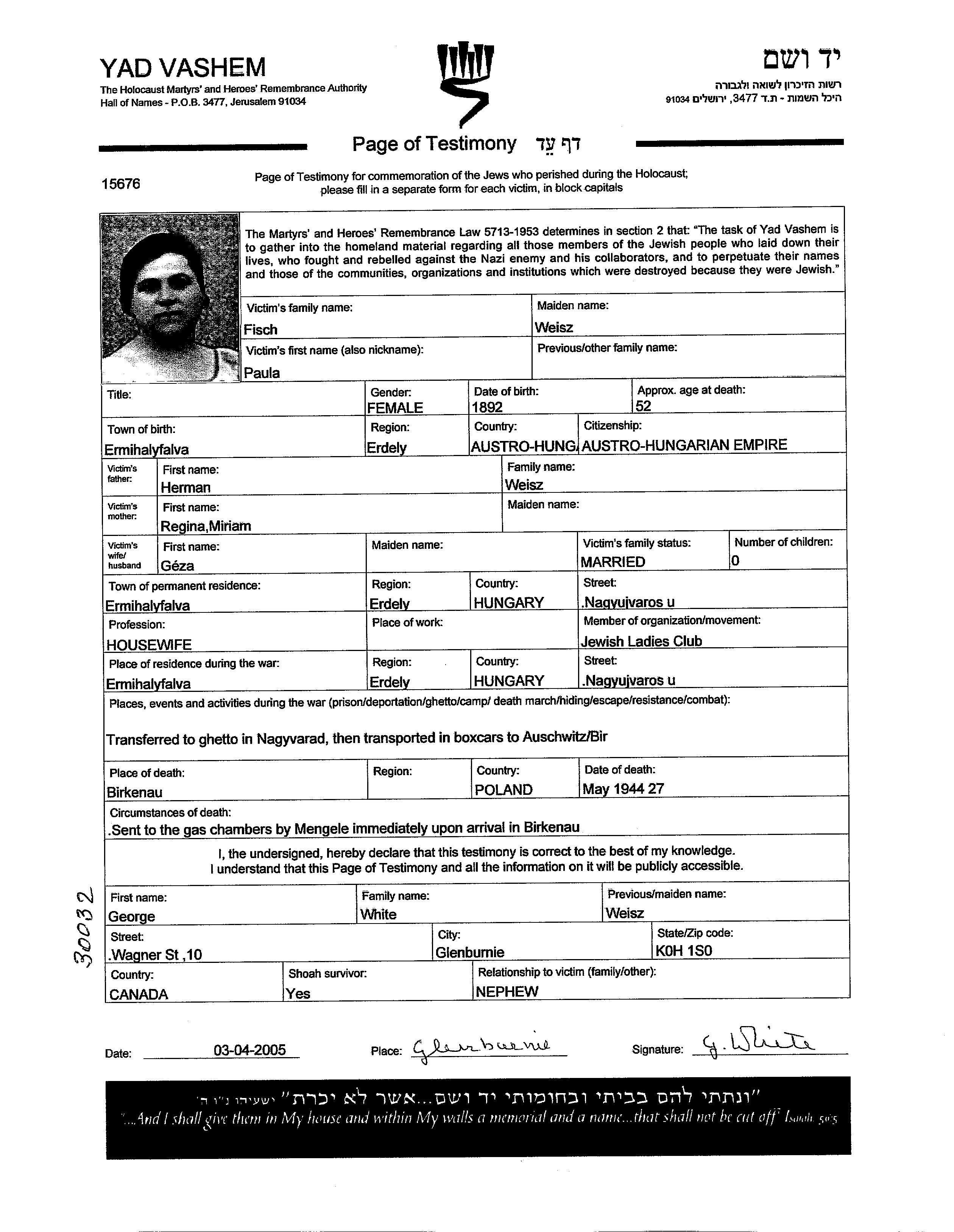Paula Fisch, geb. Weisz wurde im Jahr 1892 in Valea Lui Mihai, Rumänien geboren. Vor dem Zweiten Weltkrieg lebte sie in Valea Lui Mihai, Rumänien.