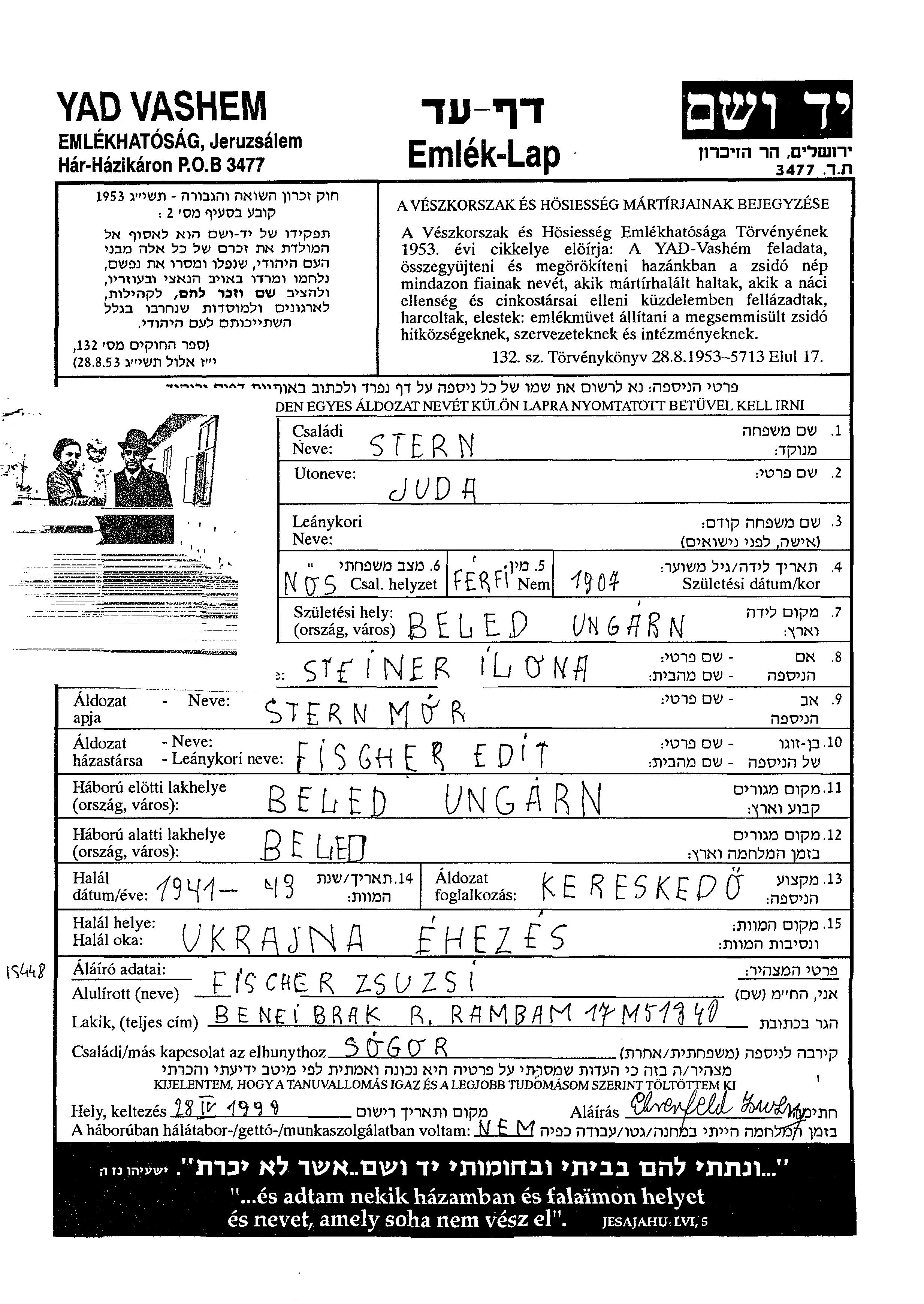 Juda Stern wurde im Jahr 1907 in Beled, Ungarn geboren. Vor dem Zweiten Weltkrieg lebte er in Beled, Ungarn.
