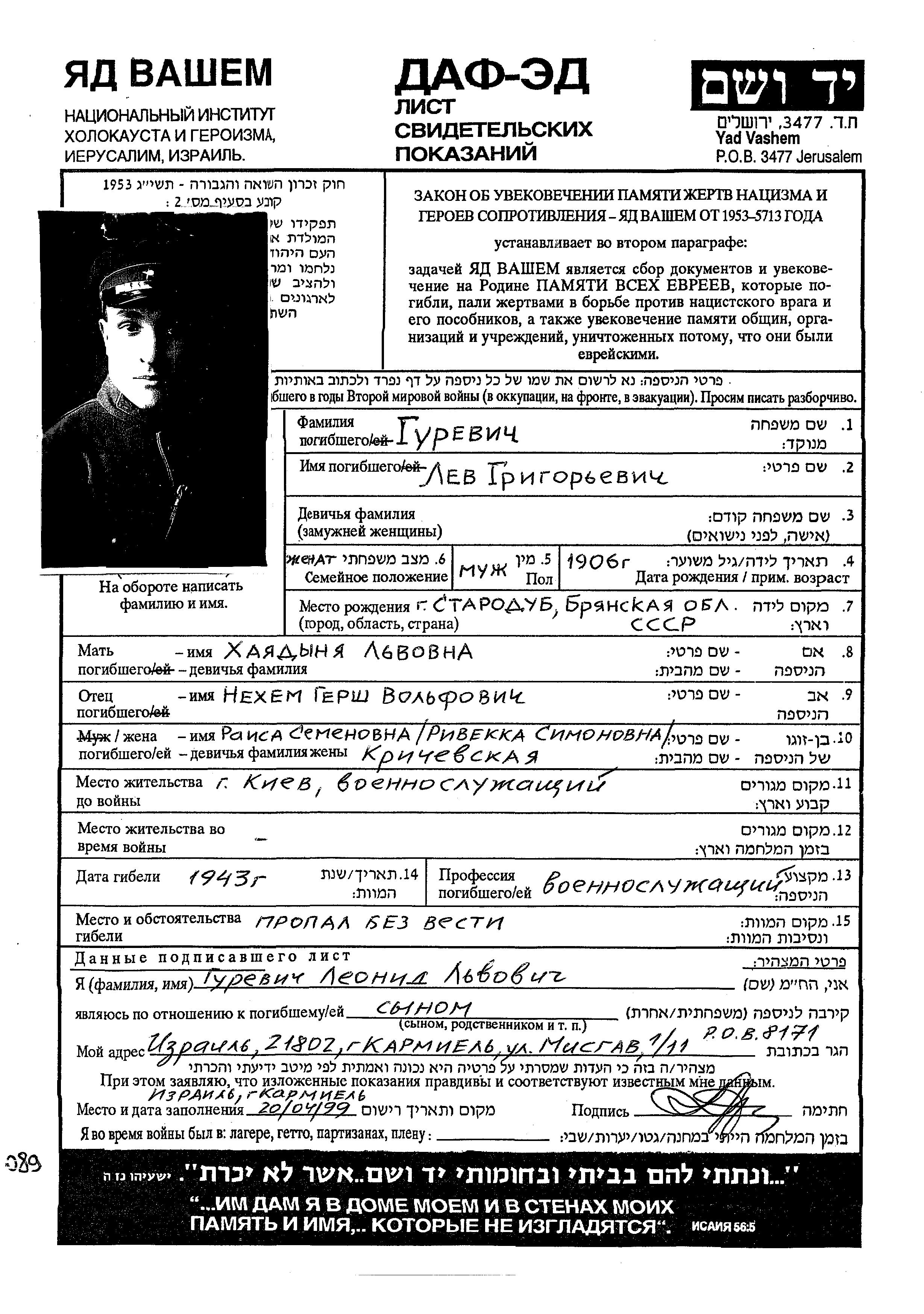 Lev Gurevich wurde im Jahr 1906 in Starodub, Russland (UdSSR) geboren. Er war Militär. Vor dem Zweiten Weltkrieg lebte er in Kiev, Ukraine (UdSSR).