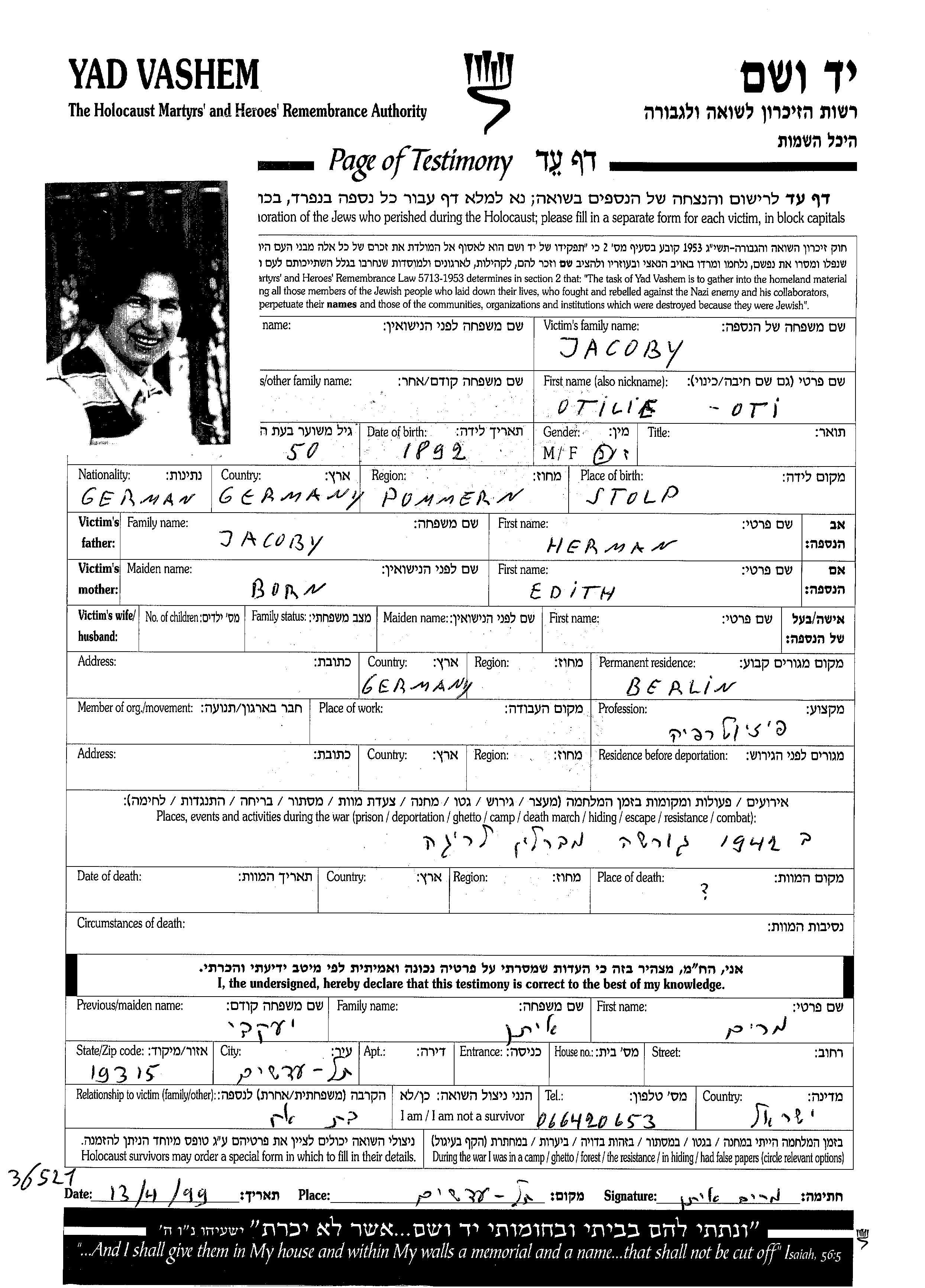 Jacoby | Otilie | 1892 | Berlin, Deutsches Reich | Gedenkblatt |