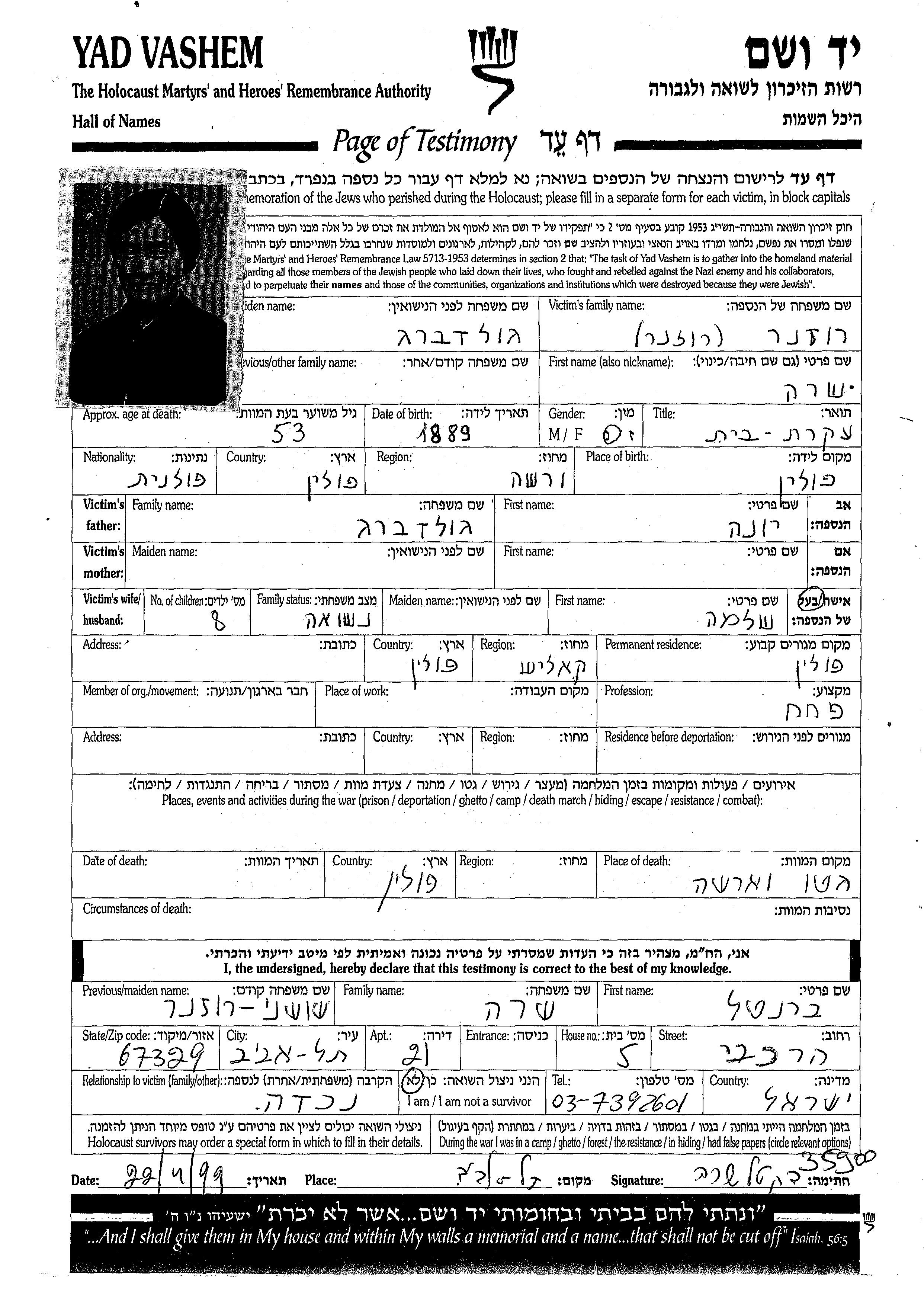 Sara Ruzhaner, geb. Goldberg wurde im Jahr 1889 in Warszawa, Polen geboren. Vor dem Zweiten Weltkrieg lebte sie in Kalisz, Polen.