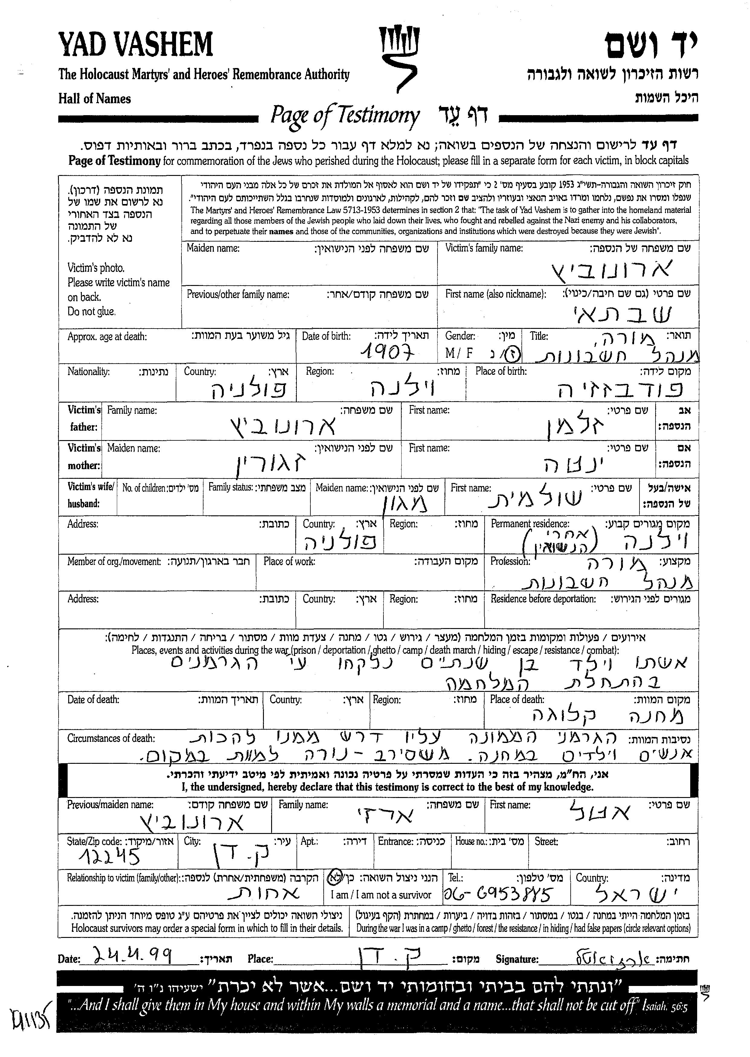 Aronovitz Shabtai 1907 Vilna, Polen Gedenkblatt