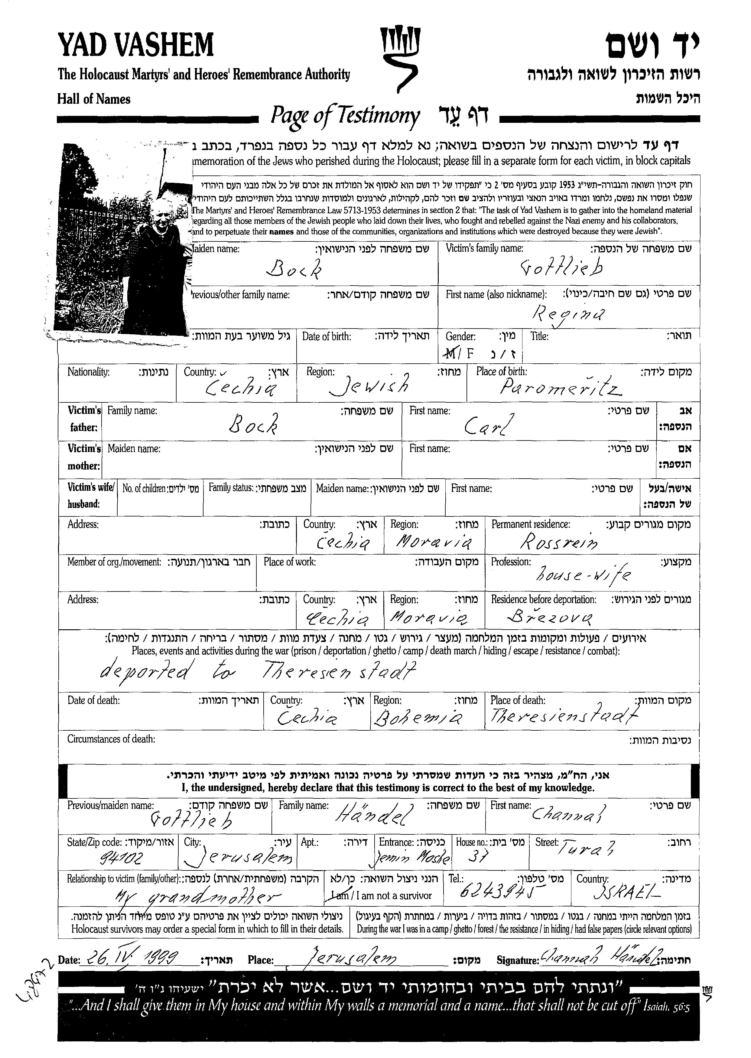 Regina Gottlieb, geb. Bock wurde in Jaromeritz, Tschechoslowakei geboren. Sie war Hausfrau. Vor dem Zweiten Weltkrieg lebte sie in Rossrein, Tschechoslowakei.