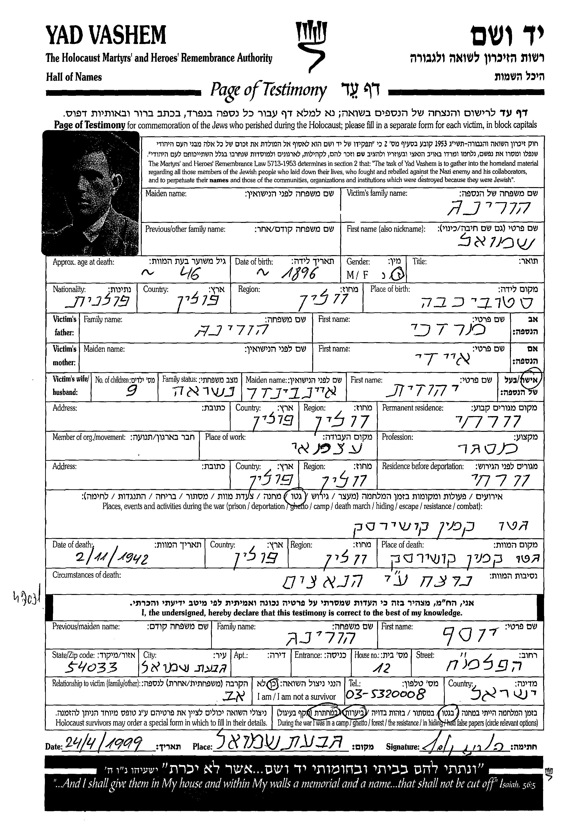 Shmuel wurde in der Schoah ermordet. Todesort: Kamien Koszyrski, Polen im Jahr 02/11/1942.