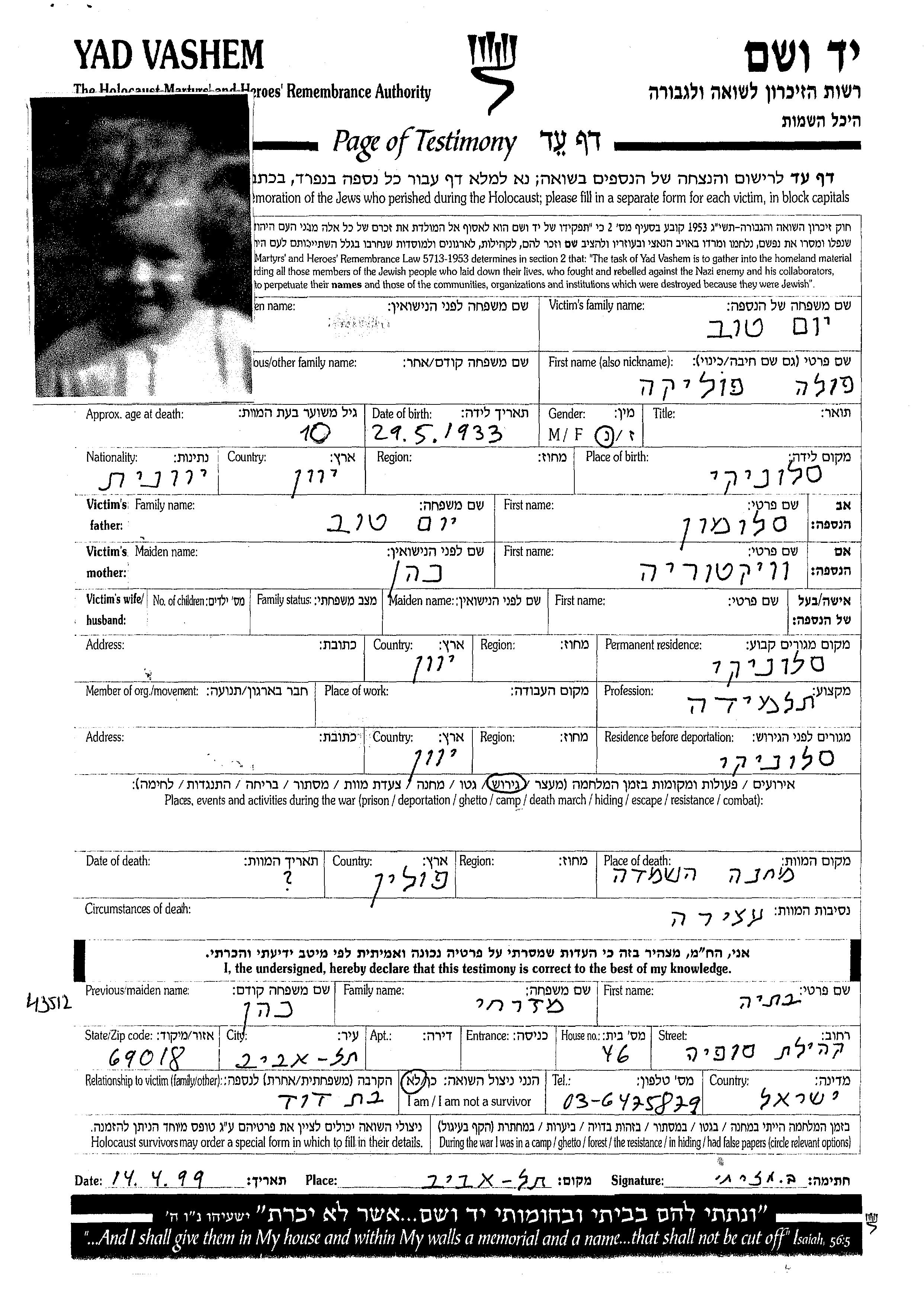Yomtov Pavlina Thessaloniki, Griechenland Liste von ermordeten Personen