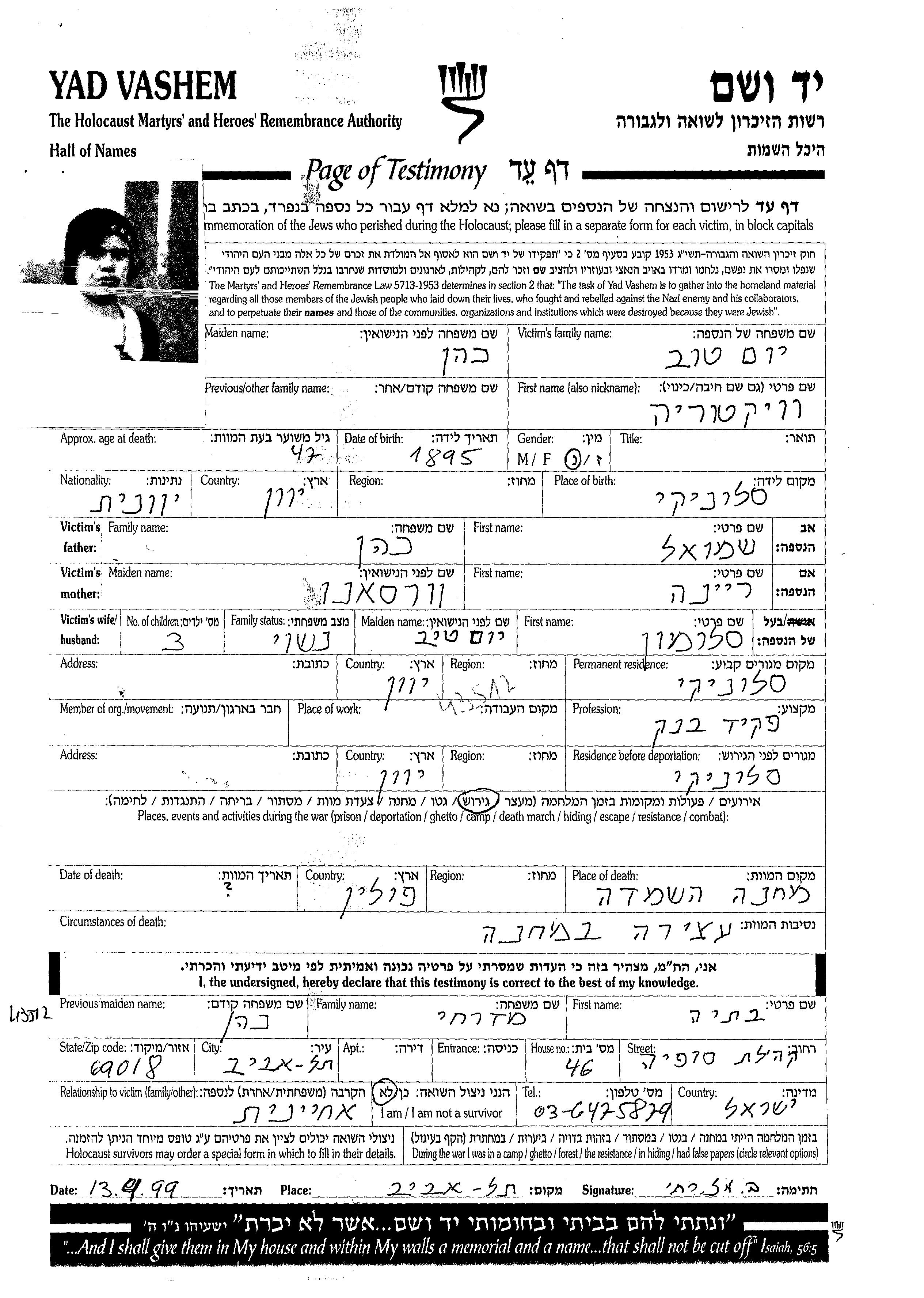 Yomtov Viktoria Thessaloniki, Griechenland Liste von ermordeten Personen