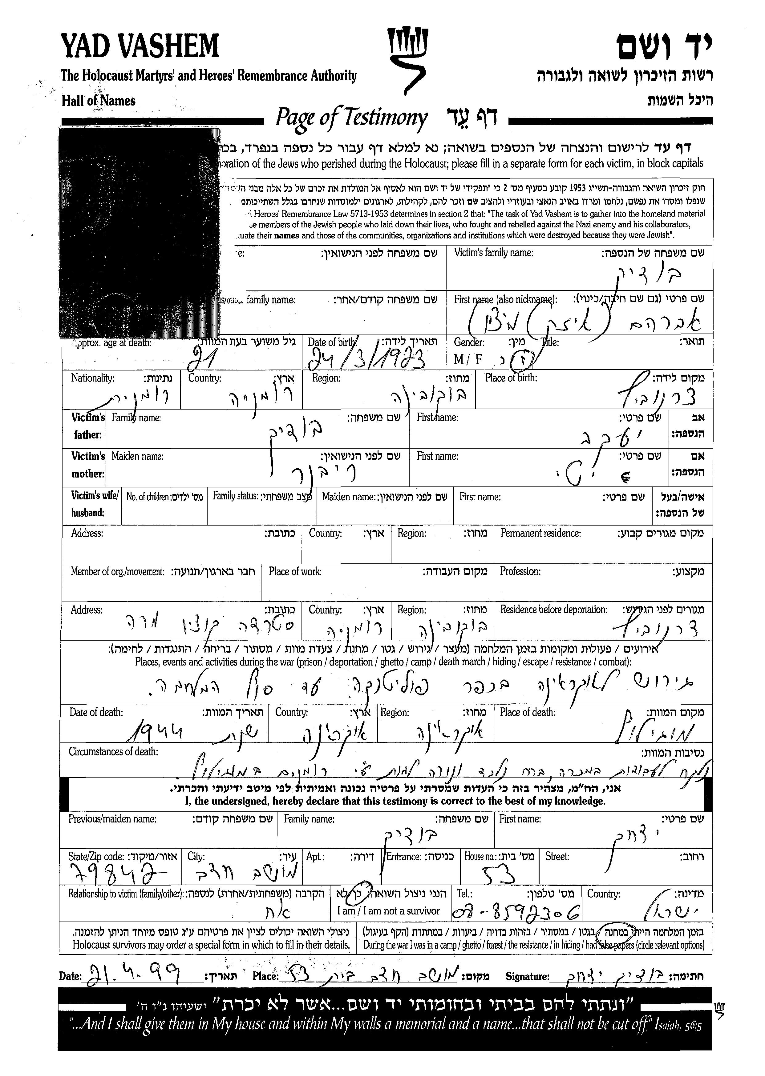Mitzio Avraham Izak wurde in der Schoah ermordet. Todesort: Mogilev Podolskiy, Ukraine (UdSSR) im Jahr 1944.