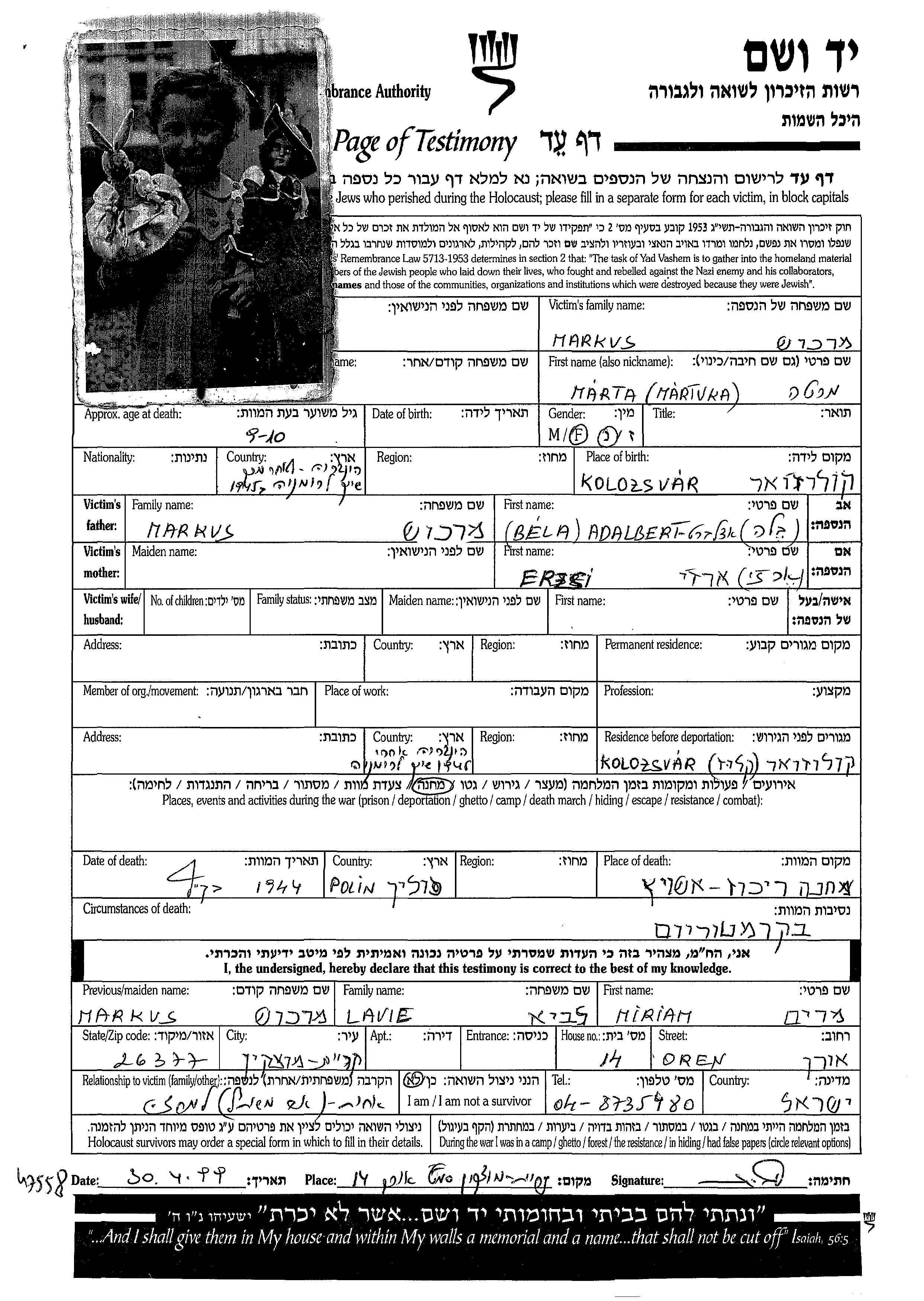 Marta wurde in der Schoah ermordet. Todesort: Auschwitz, Polen im Jahr 1944.