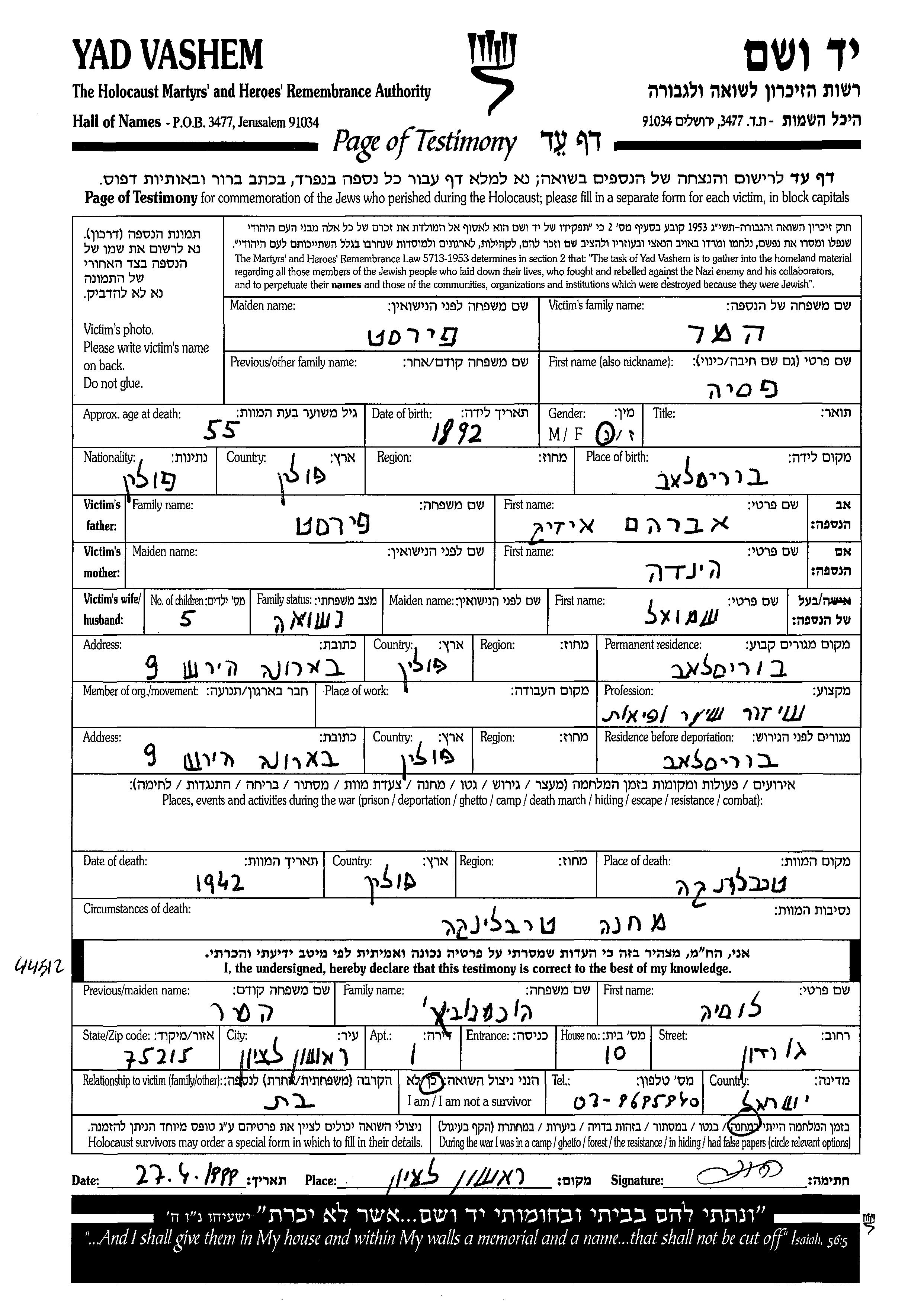 Pesia Hamer, geb. First wurde im Jahr 1892 in Boryslaw, Polen geboren. Sie war Friseur/-in. Vor dem Zweiten Weltkrieg lebte sie in Boryslaw, Polen. Pesia wurde in der Schoah ermordet. Todesort: Treblinka, Polen im Jahr 1942.
