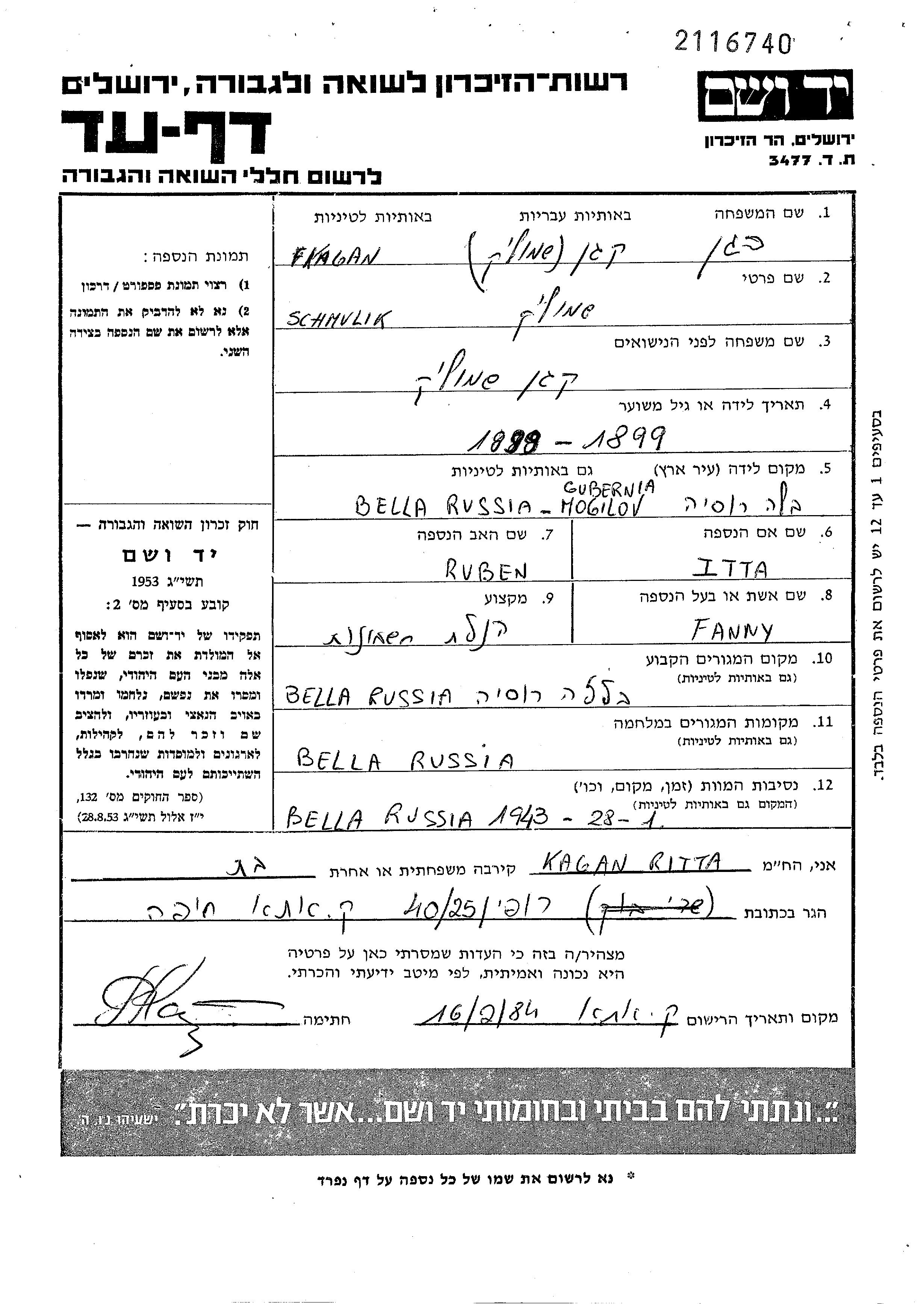 Schmulik Kagan wurde in Mogilev, Weißrussland (UdSSR) geboren. Er war der Sohn von Reuven und Itta. Er war Buchhalter/-in und mit Fanny Verheiratet. Vor dem Zweiten Weltkrieg lebte er in Weißrussland (UdSSR). Während des Krieges war er in Weißrussland (UdSSR).