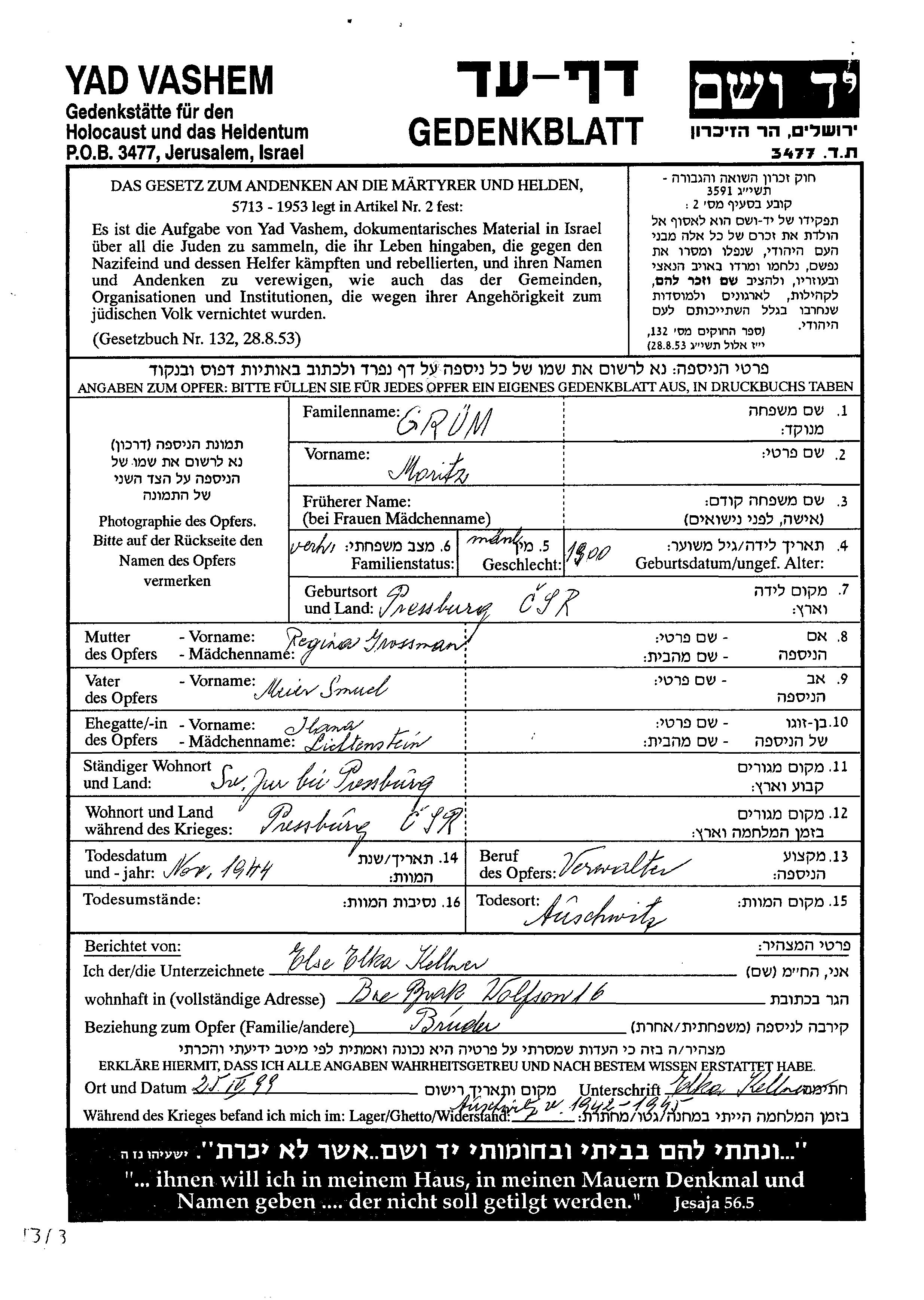 Moritz Gruem Grum wurde im Jahr 1900 in Bratislava, Tschechoslowakei geboren. Er war Verwalter. Vor dem Zweiten Weltkrieg lebte er in Svaty Jur, Tschechoslowakei.
