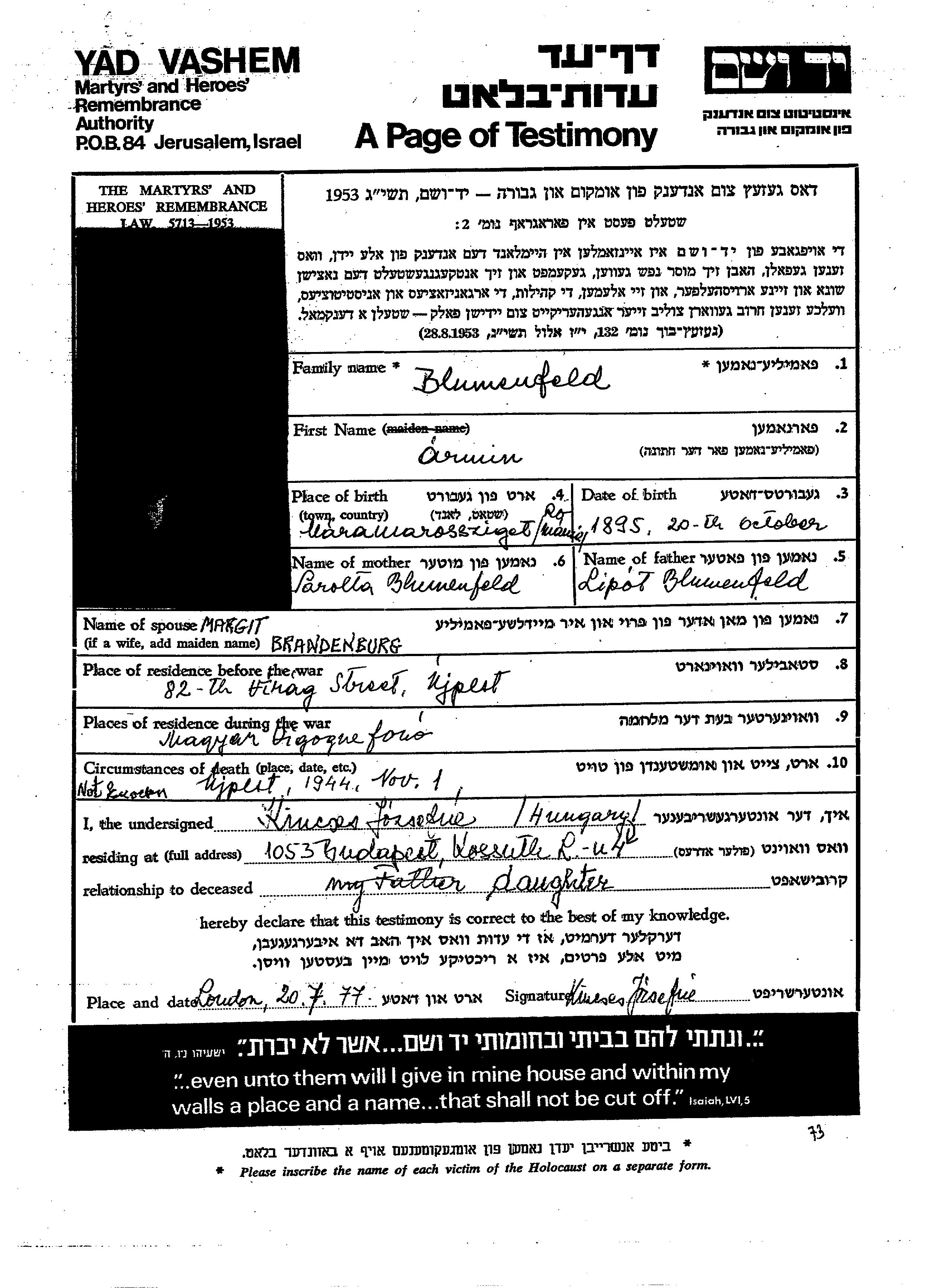 Armin Blumenfeld wurde im Jahr 1895 in Sighet, Rumänien geboren. Vor dem Zweiten Weltkrieg lebte er in Ujpest, Ungarn.