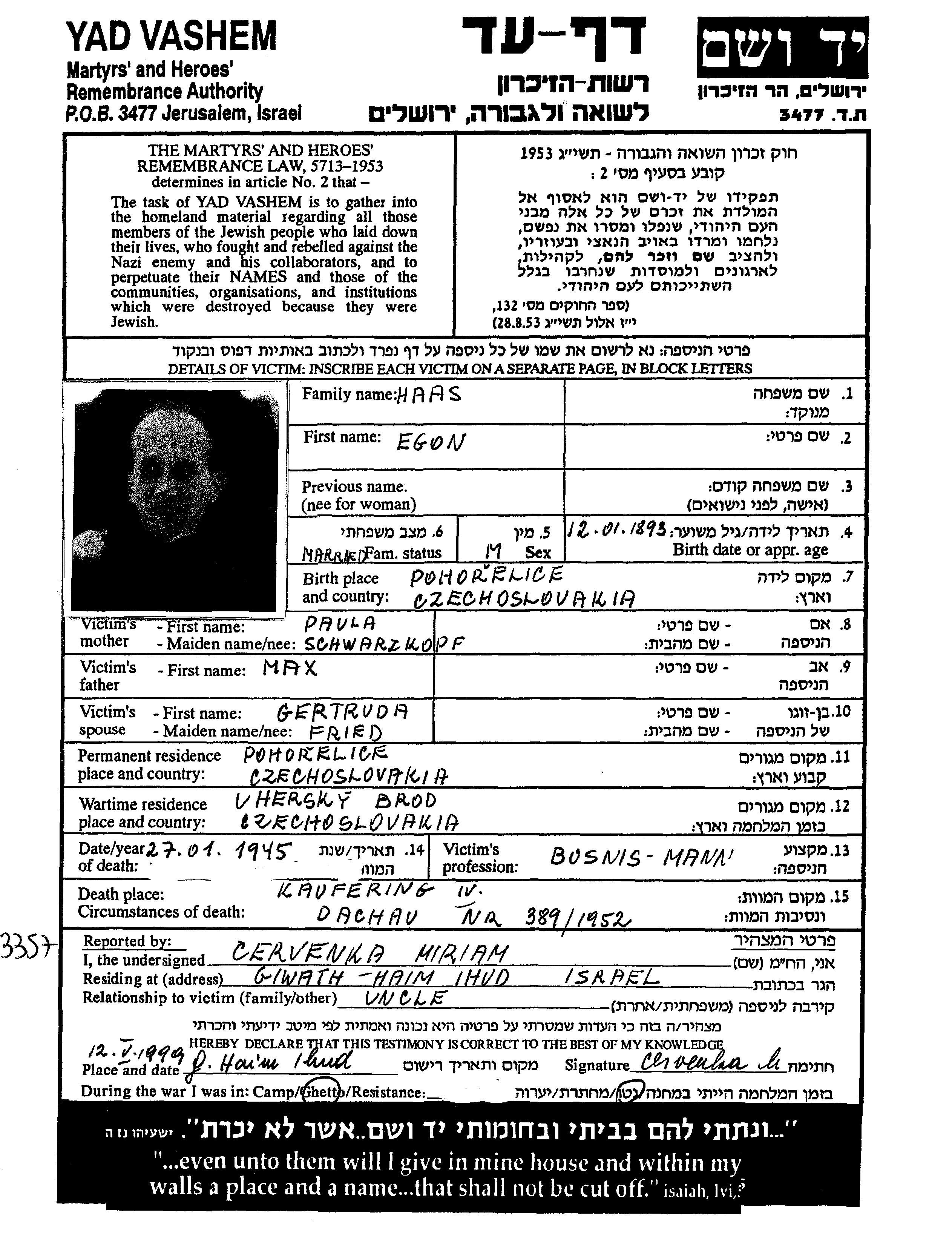 Egon Haas wurde im Jahr 1893 in Pohorelice, Tschechoslowakei geboren. Er war Geschäftsmann. Vor dem Zweiten Weltkrieg lebte er in Pohorelice, Tschechoslowakei.