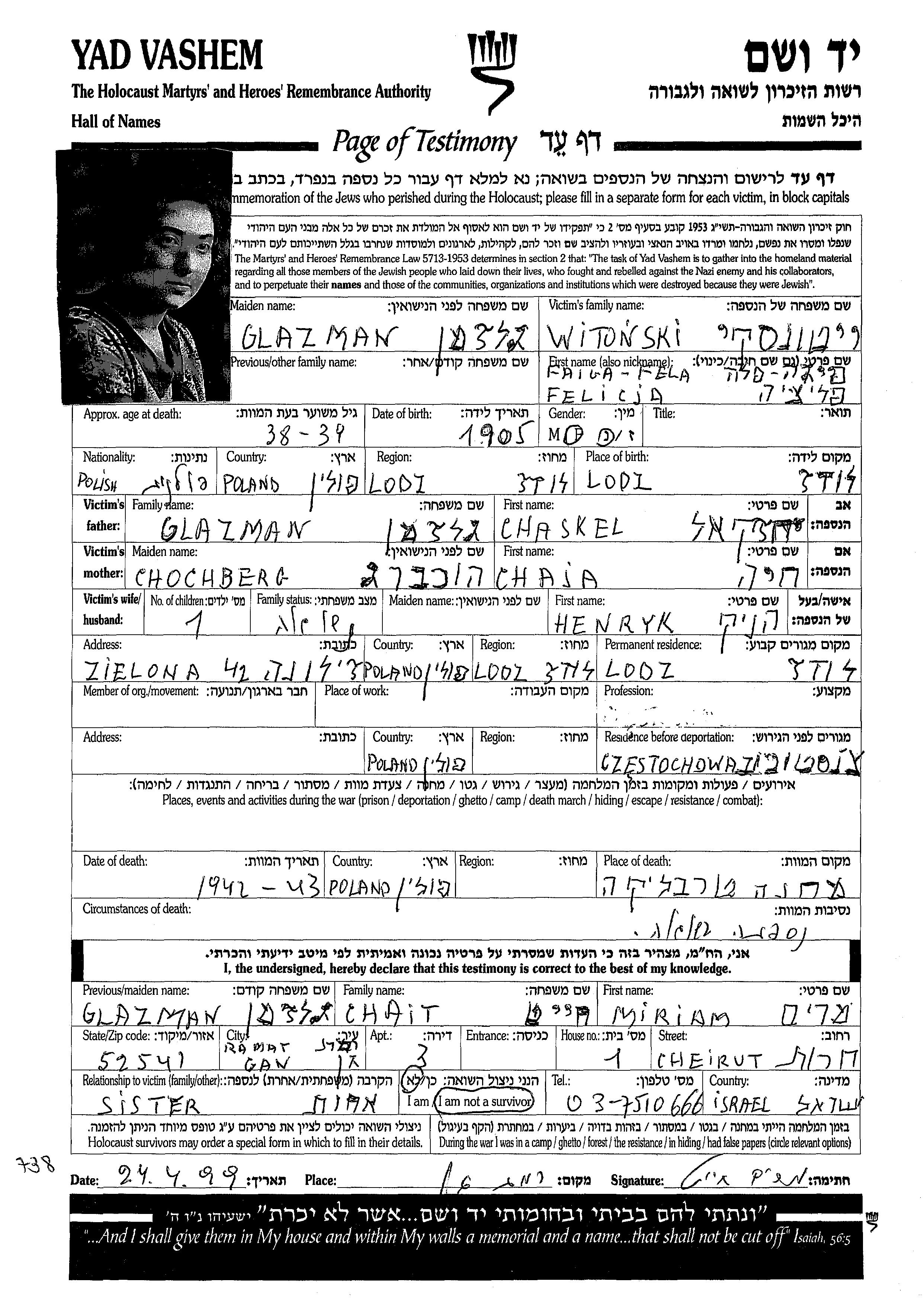 Faiga Fela Vitonski, geb. Glazman wurde im Jahr 1905 in Łódź, Polen geboren. Vor dem Zweiten Weltkrieg lebte sie in Łódź, Polen.