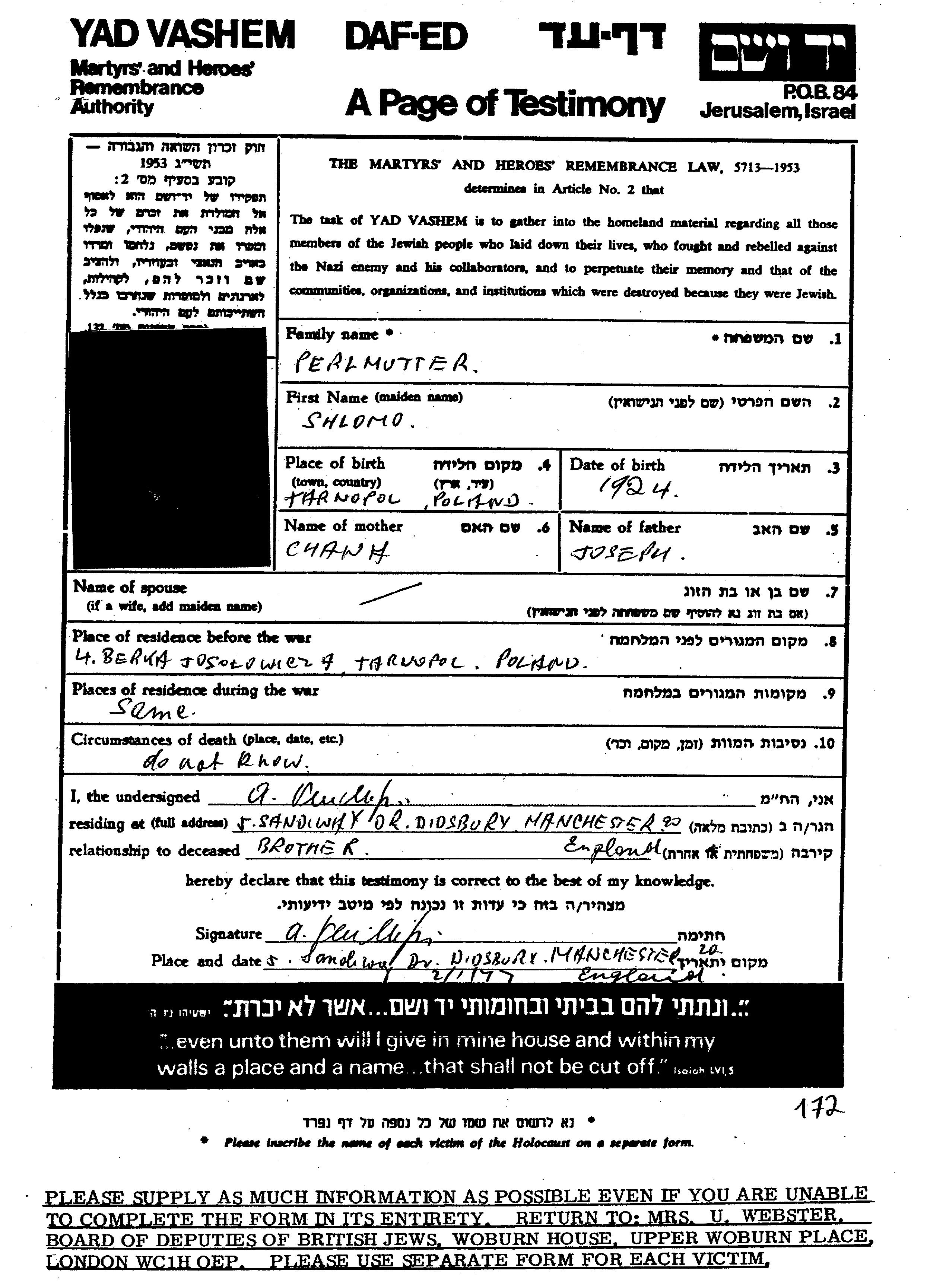 Shlomo Perlmutter wurde im Jahr 1924 in Tarnopol, Polen geboren. Vor dem Zweiten Weltkrieg lebte er in Tarnopol, Polen.