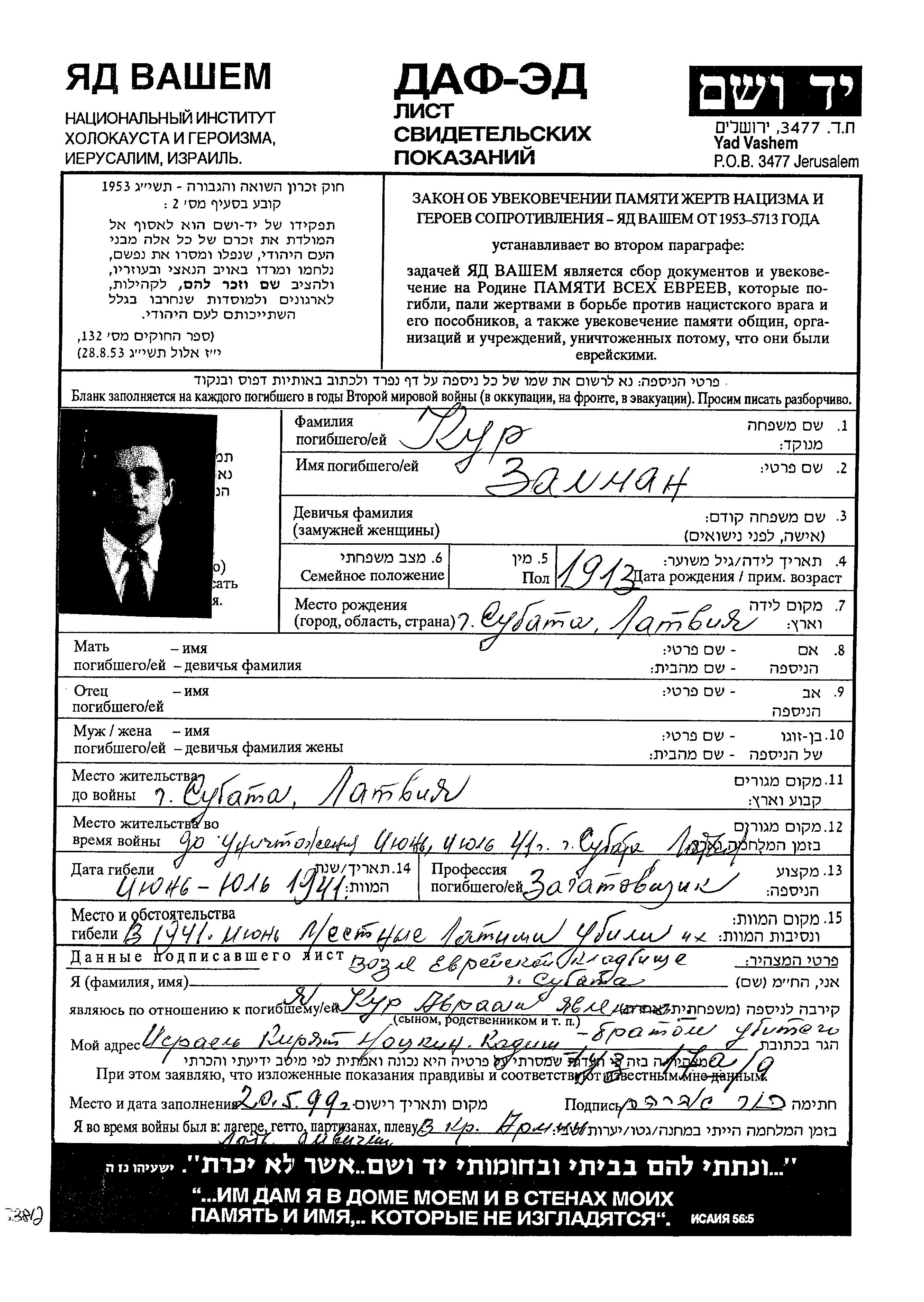 Zalman wurde in der Schoah ermordet. Todesort: Subata, Lettland im Jahr 07/1941.