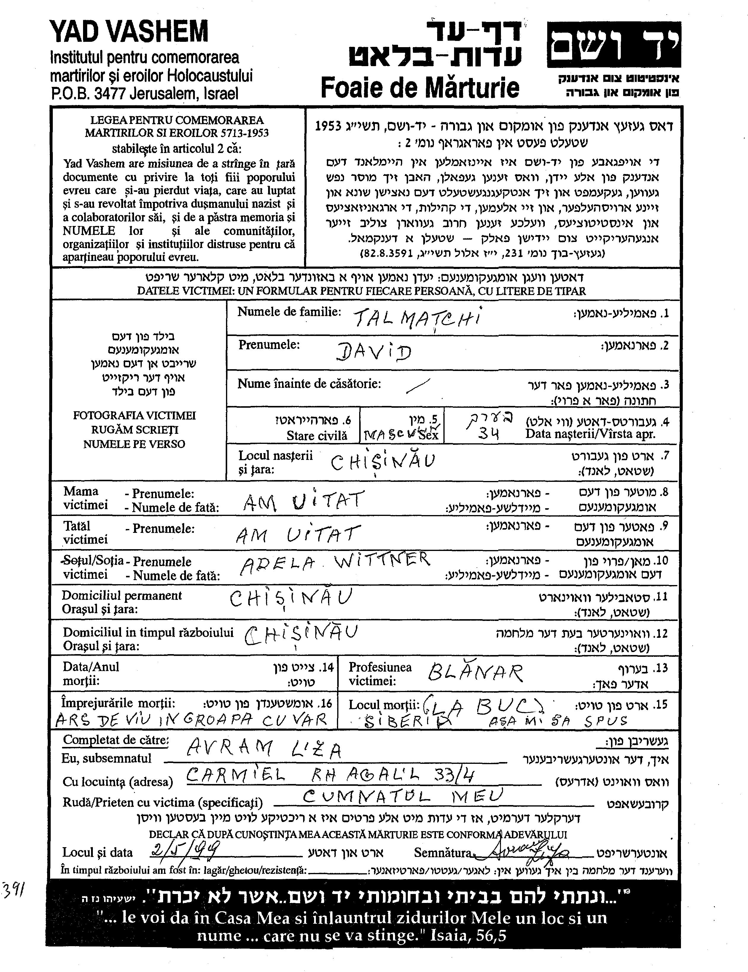 David Talmatchi wurde in Chisinau, Rumänien geboren. Er war Kürschner/-in. Vor dem Zweiten Weltkrieg lebte er in Chisinau, Rumänien.