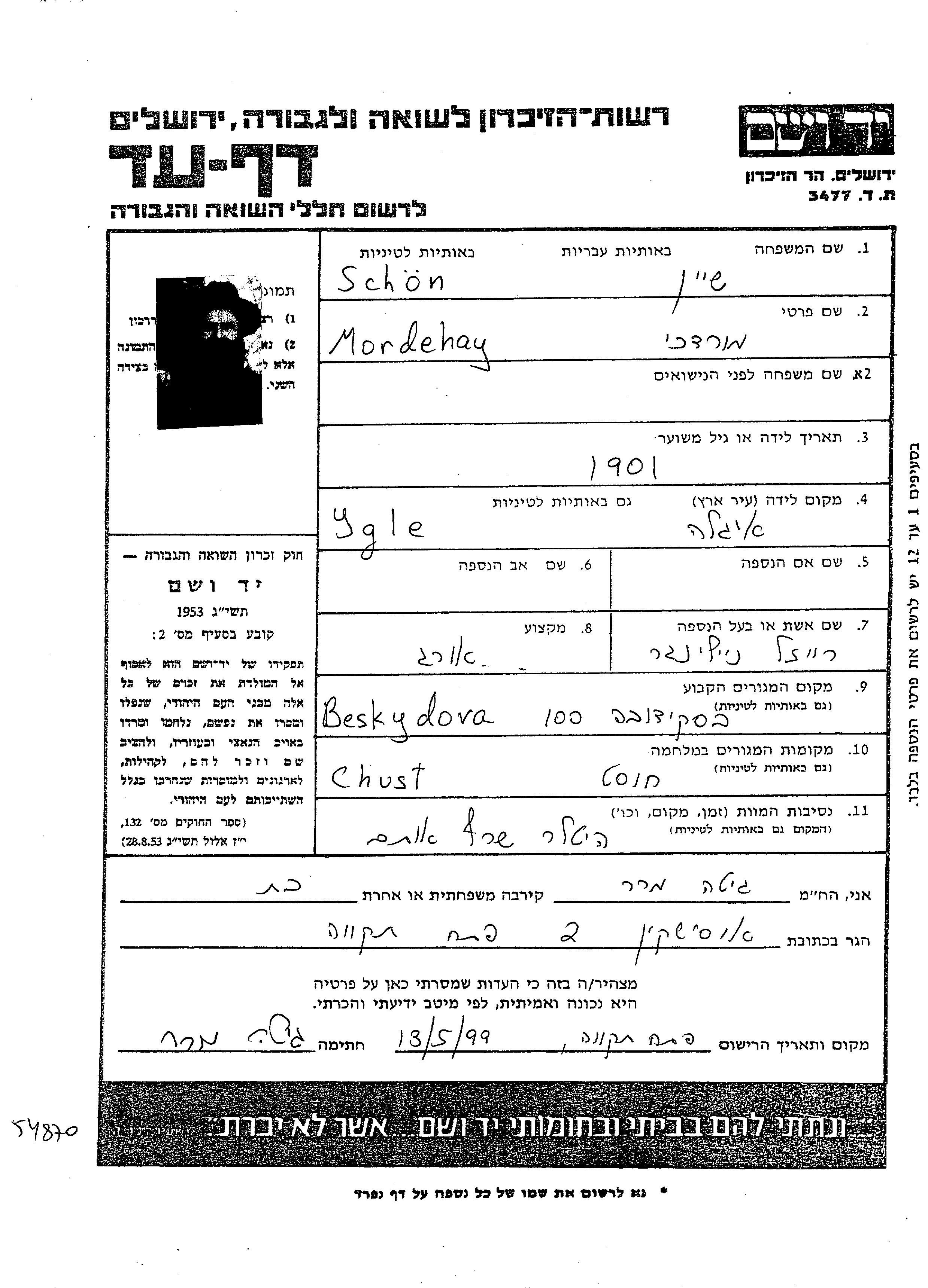 Mordekhai wurde in der Schoah ermordet. Todesort: unbekannter Ort.